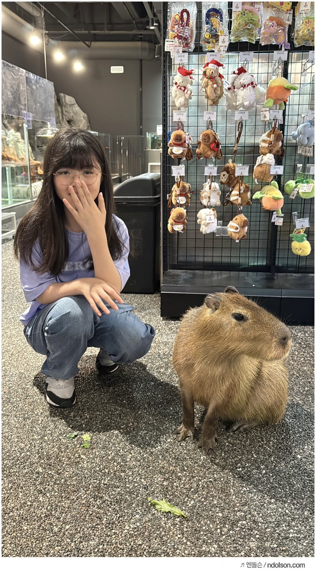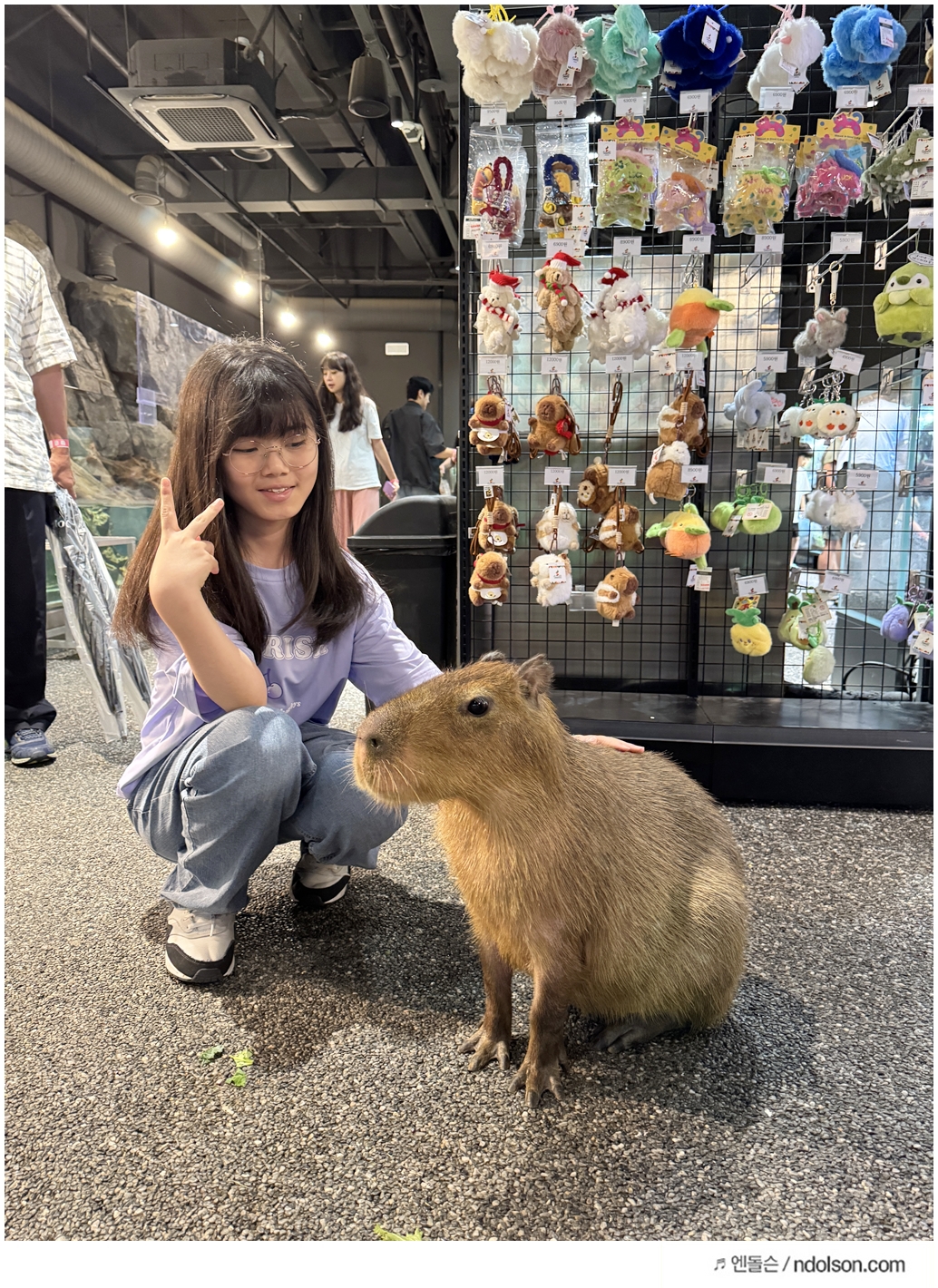 거북이들이 정말 순해서 딸아이가 살살 등을 쓰다듬어도 전혀 놀라거나 하지 않았어요. 오히려 사람을 좋아하는 것 같더라구요. 카피바라도 마찬가지로 사람을 무서워하지 않아서 가까이 다가가 사진 찍기도 쉬웠고요.