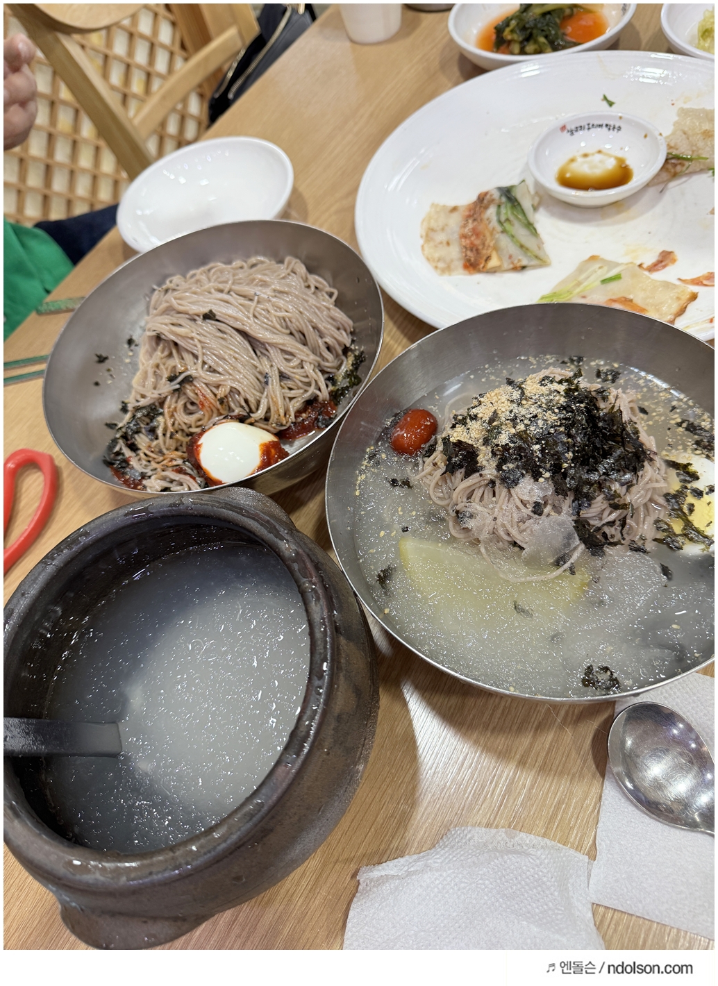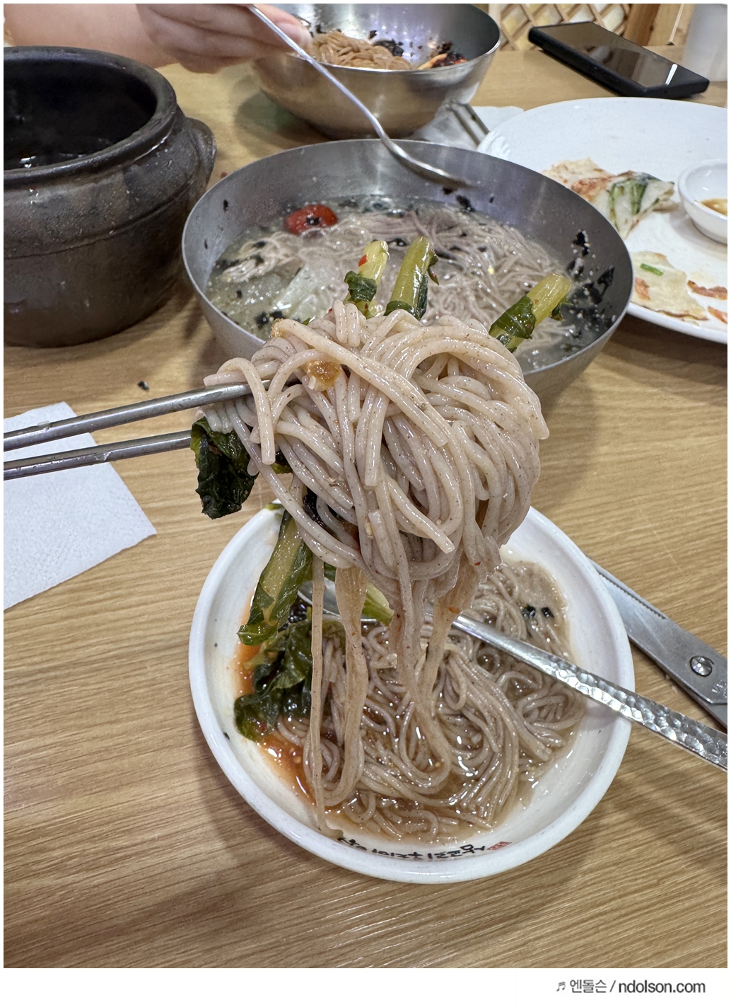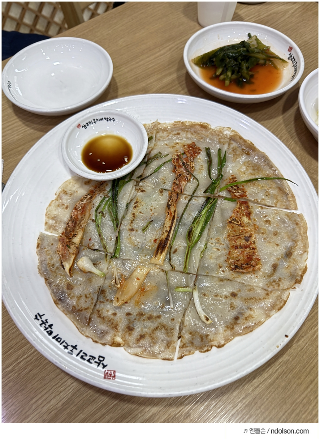 메밀전은 바삭하면서도 메밀의 고소한 맛이 잘 살아있었어요. 막국수와 함께 먹으니 든든한 한 끼가 되더라고요. 전 자체도 기름지지 않고 담백해서 부담 없이 먹을 수 있었어요.