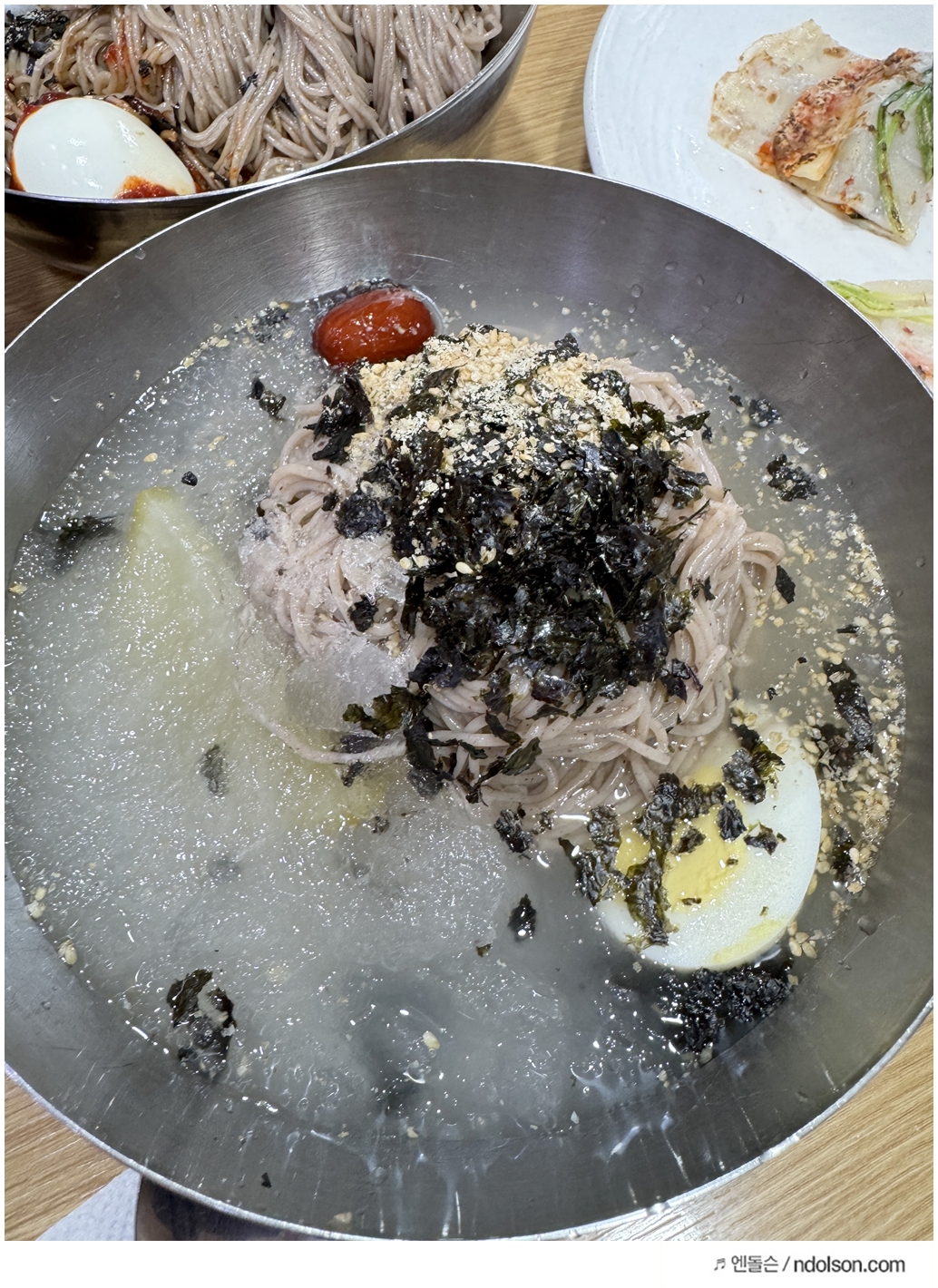 드디어 나온 동치미막국수를 보는 순간 "이게 진짜 막국수구나!" 싶었어요. 맑고 시원해 보이는 동치미 국물에 메밀면이 들어있는데, 비주얼부터 시원함이 느껴지더라고요.