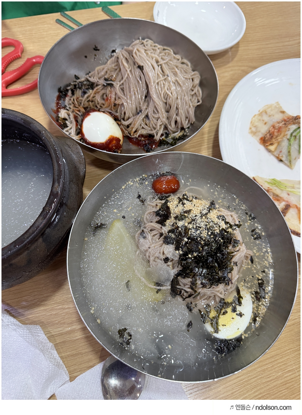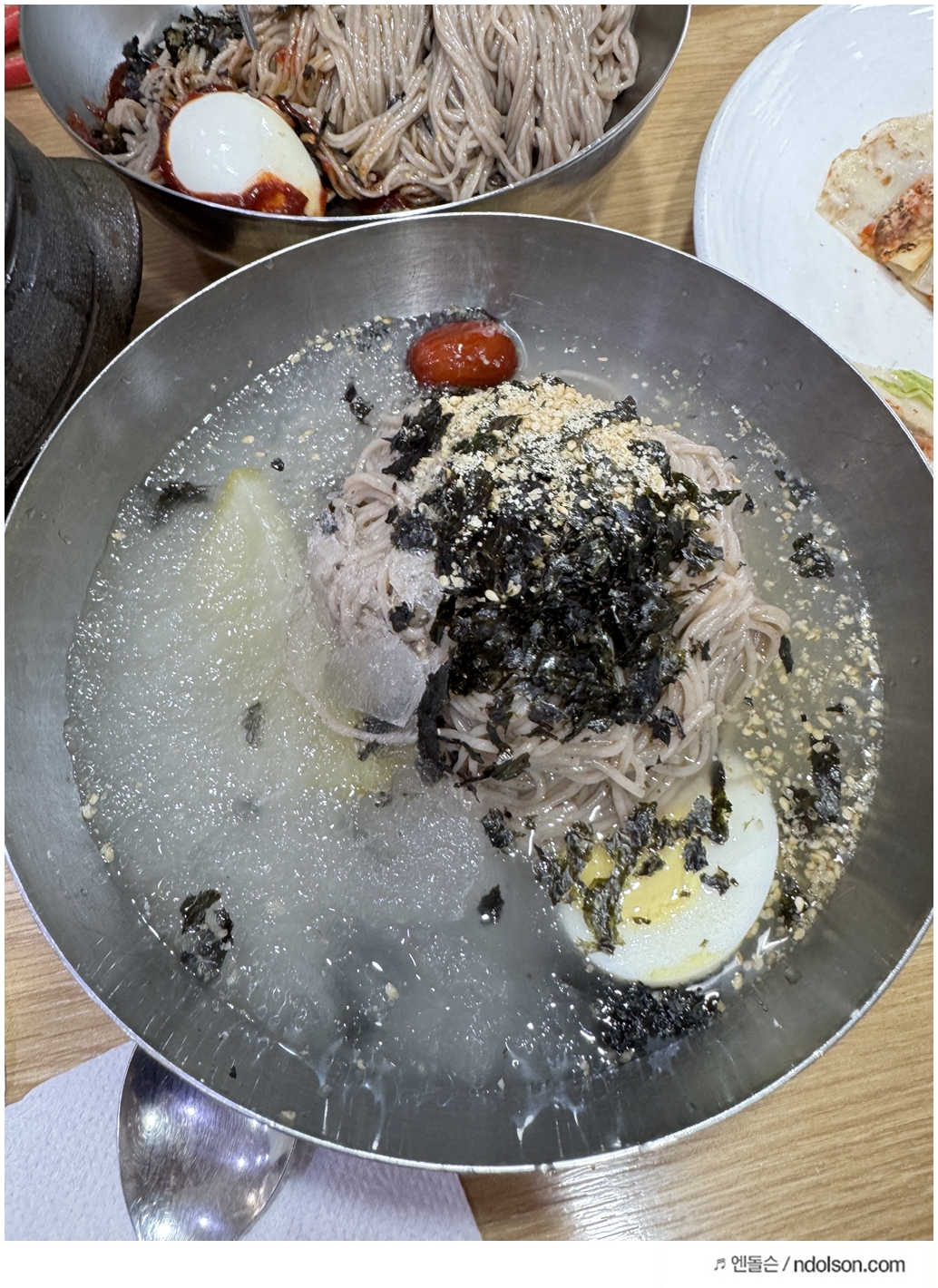 면도 정말 인상적이었어요. 메밀 함량이 70% 이상이라고 하던데, 메밀 특유의 향과 쫄깃한 식감이 정말 좋았어요. 일반 밀면과는 확실히 다른 독특한 맛과 식감이 있더라고요.