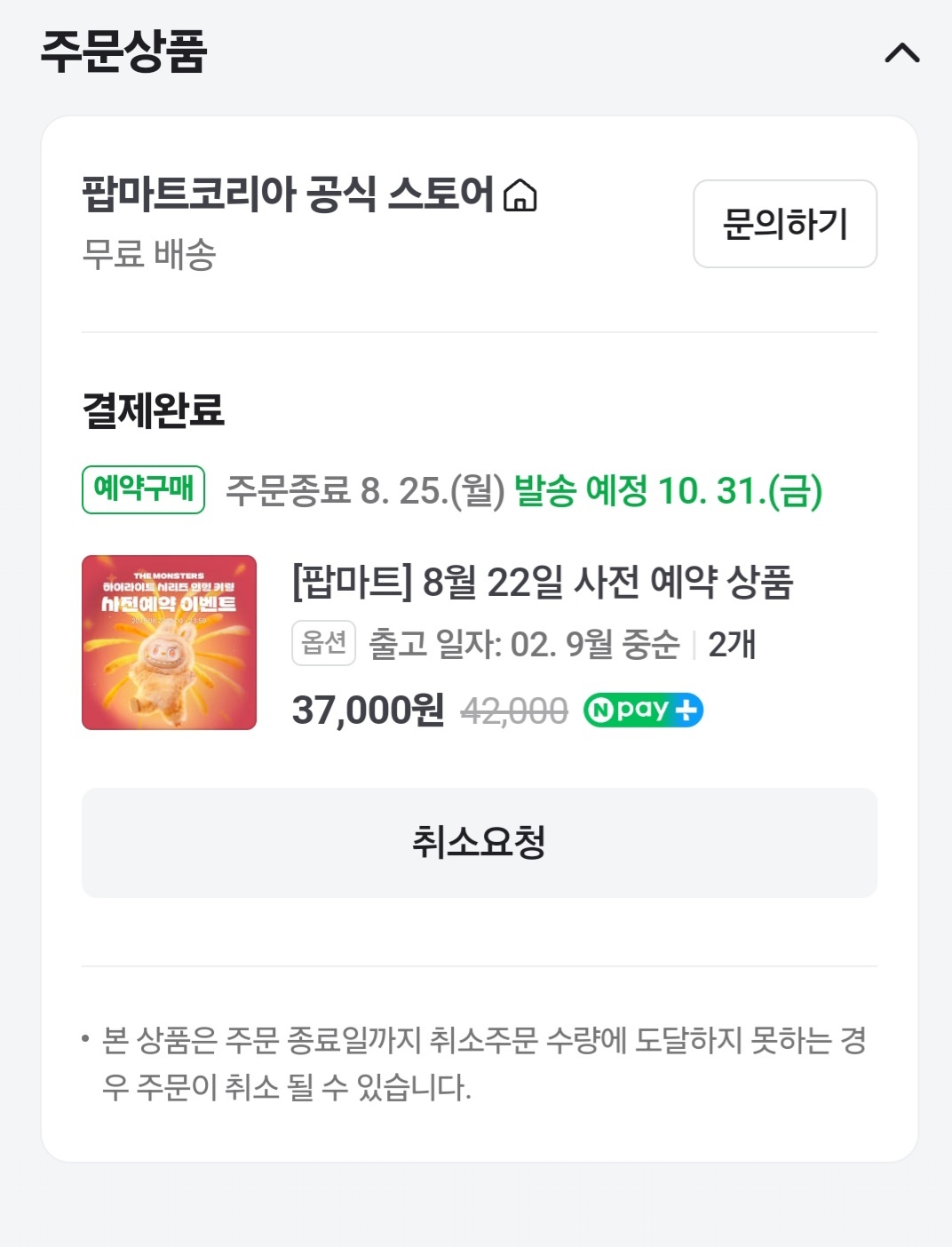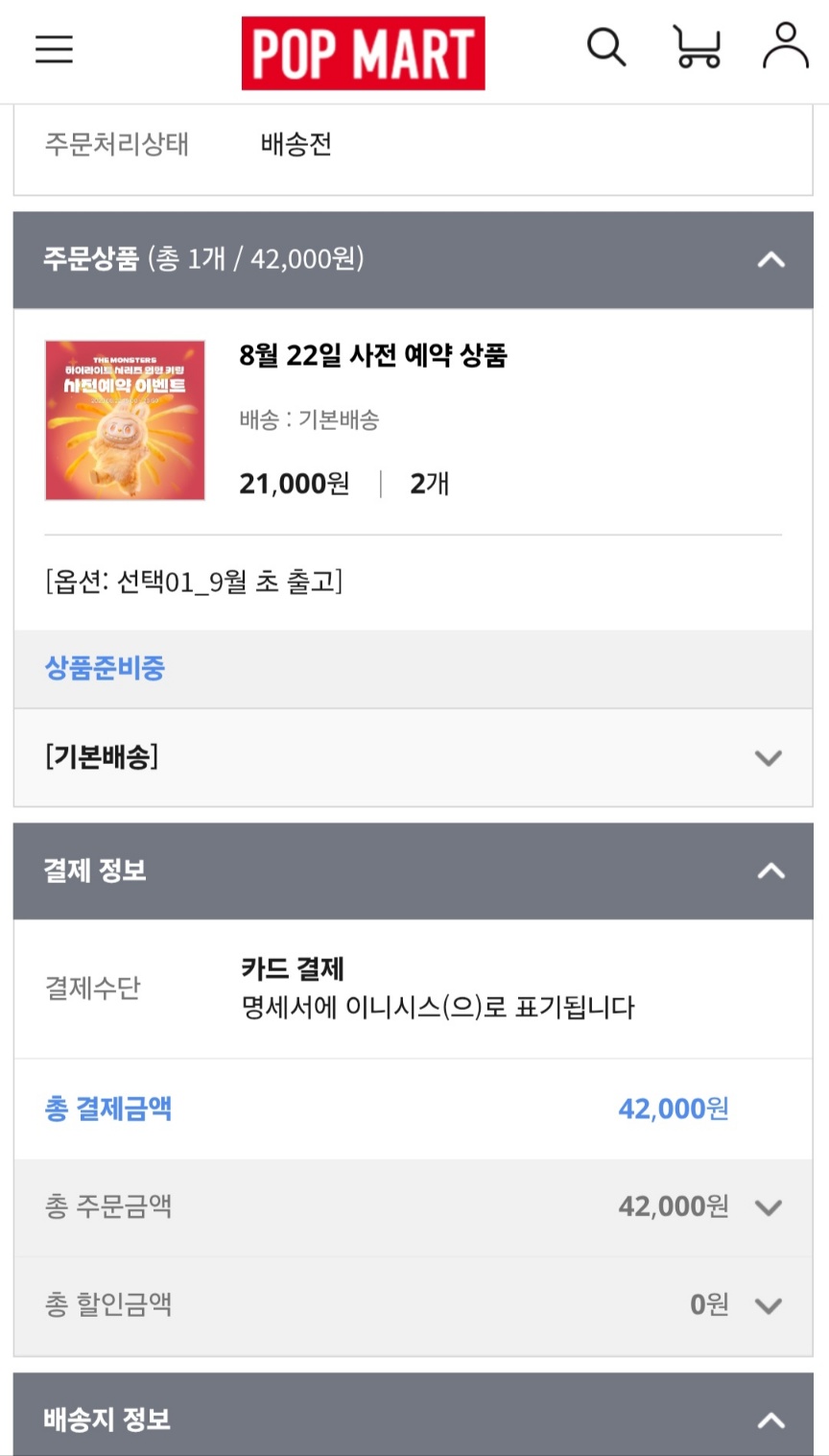 라부부 인형의 경우 인기 제품인 만큼 한정 수량 판매가 기본입니다. 예약 판매는 결제 즉시 완료되어야 하며, 결제 실패 시 바로 기회가 사라질 수 있습니다. 배송은 예약 시점에 따라 9월 또는 10월 등 차등적으로 진행되며, 저는 이번에 각각 두 개씩 나눠서 확보할 수 있었습니다.