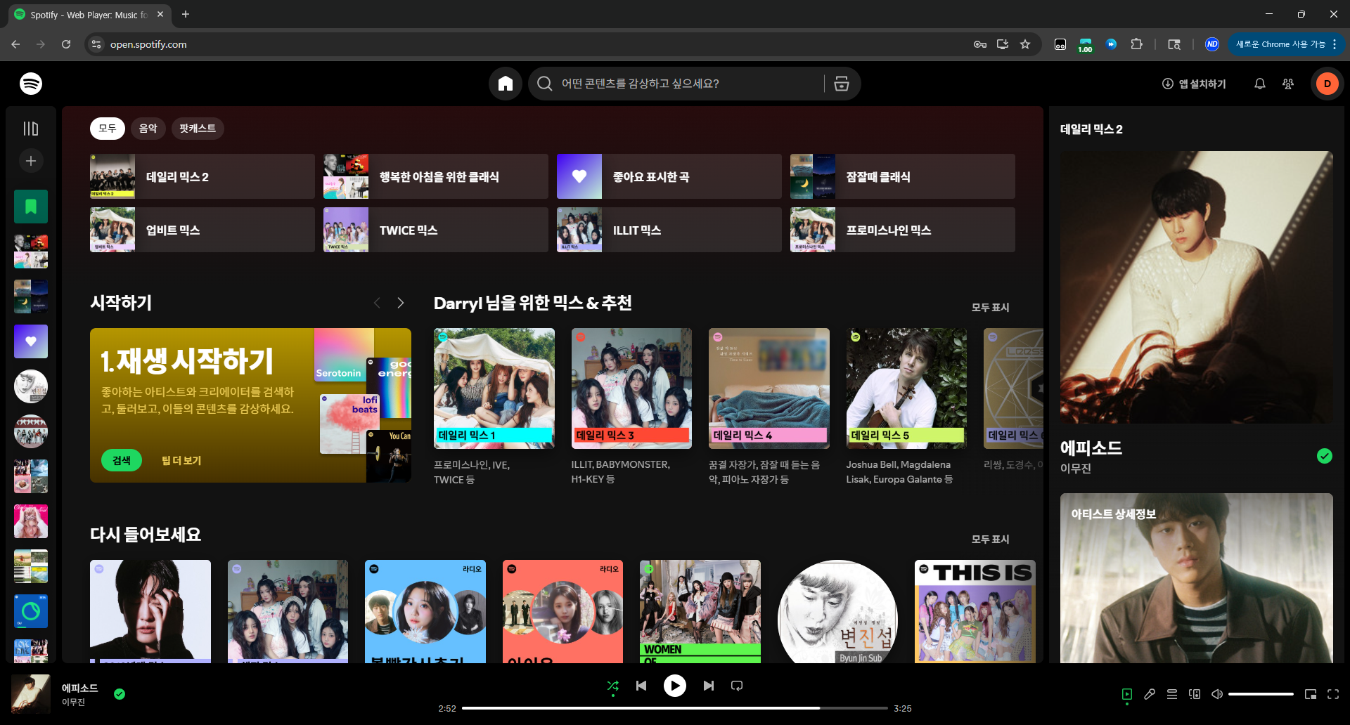 그리고 곡 선택 자유도. 무료는 셔플 재생만 가능해서 내가 딱 듣고 싶은 노래를 바로 틀 수 없잖아요. 하지만 유료는 원하는 곡을 바로 재생할 수 있고, 무제한으로 건너뛰기도 돼서 답답함이 사라집니다. 저 같은 경우는 최신곡 몇 곡을 반복해서 듣는 편인데, 프리미엄에서는 그냥 원하는 만큼 반복해도 아무 제약이 없으니 훨씬 만족스럽습니다.