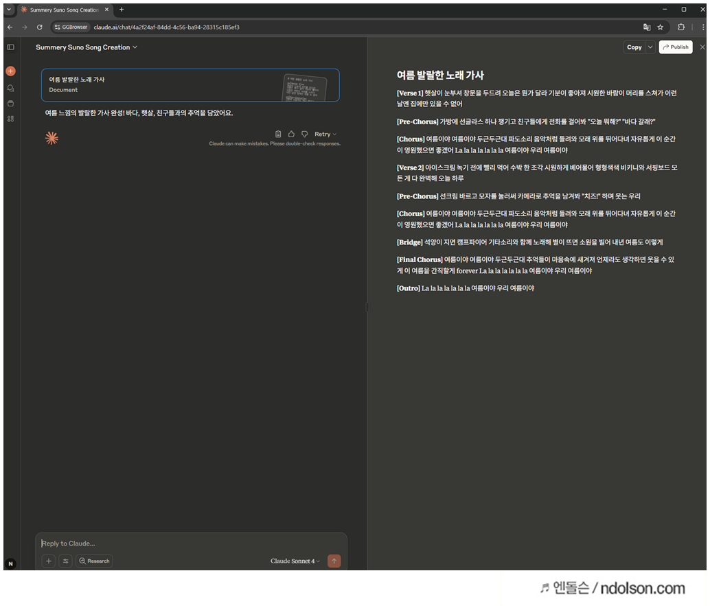 챗GPT나 클로드 AI를 이용해서 만들 음악의 가사와 명령프롬프트를 작성하고 수노 ai에게 요청합니다.