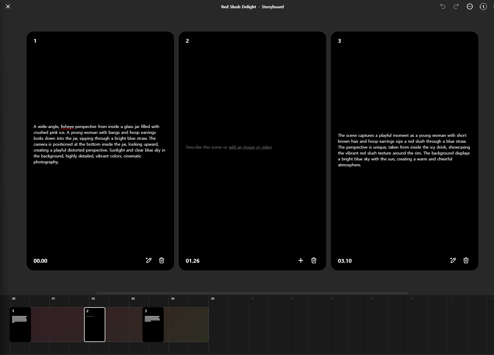 처음에는 단순히 문장을 입력하는 수준이었는데, 조금 더 욕심을 내서 ‘fisheye 시점으로 유리컵 안쪽에서 촬영된 듯한 영상, 햇살이 비치는 파란 하늘, 생생한 컬러감’ 같은 디테일을 추가하니 결과물이 훨씬 영화적인 느낌을 줬다. 스토리보드 기능을 활용하면 장면을 컷 단위로 나눠서 설명할 수 있는데, 이때 인물의 표정이나 카메라 각도까지 구체적으로 지정할 수 있어 짧은 광고 영상 같은 퀄리티가 나온다.
