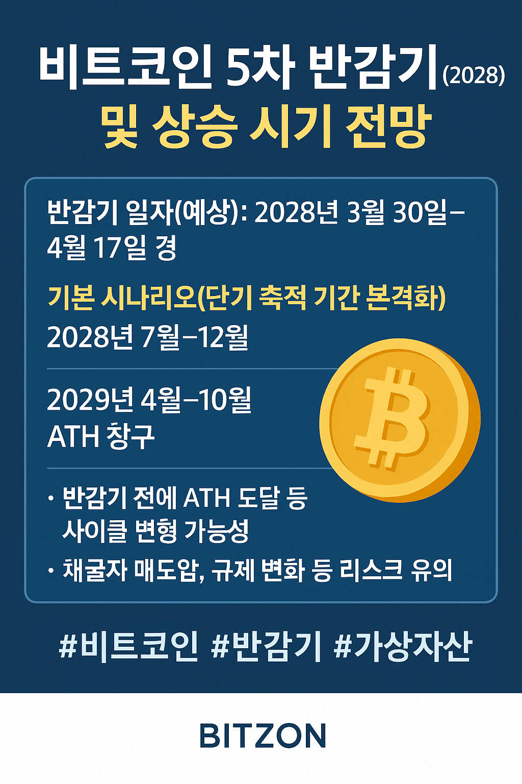 - 베이스케이스: 2028년 하반기(7~12월) 본격 랠리, 2029년 4~10월 ATH 시도