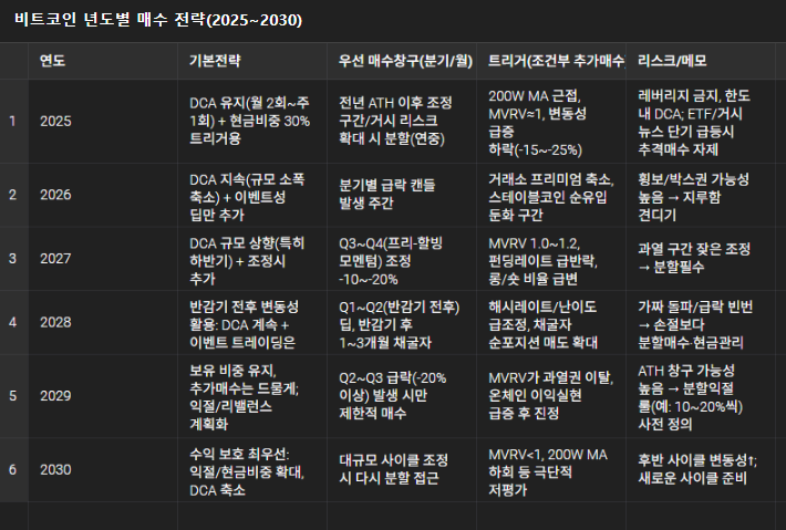 비트코인 매입의 최적 시점을 단정짓기는 어렵지만, “지금부터 소액 분할매수를 시작하고, 특정 지표가 충족되면 추가 매수”하는 전략이 현실적입니다. 장기 사이클과 시장 리스크를 모두 고려하면서도 안정적인 자산 배분을 가능하게 합니다.