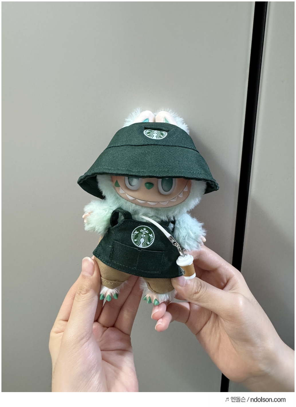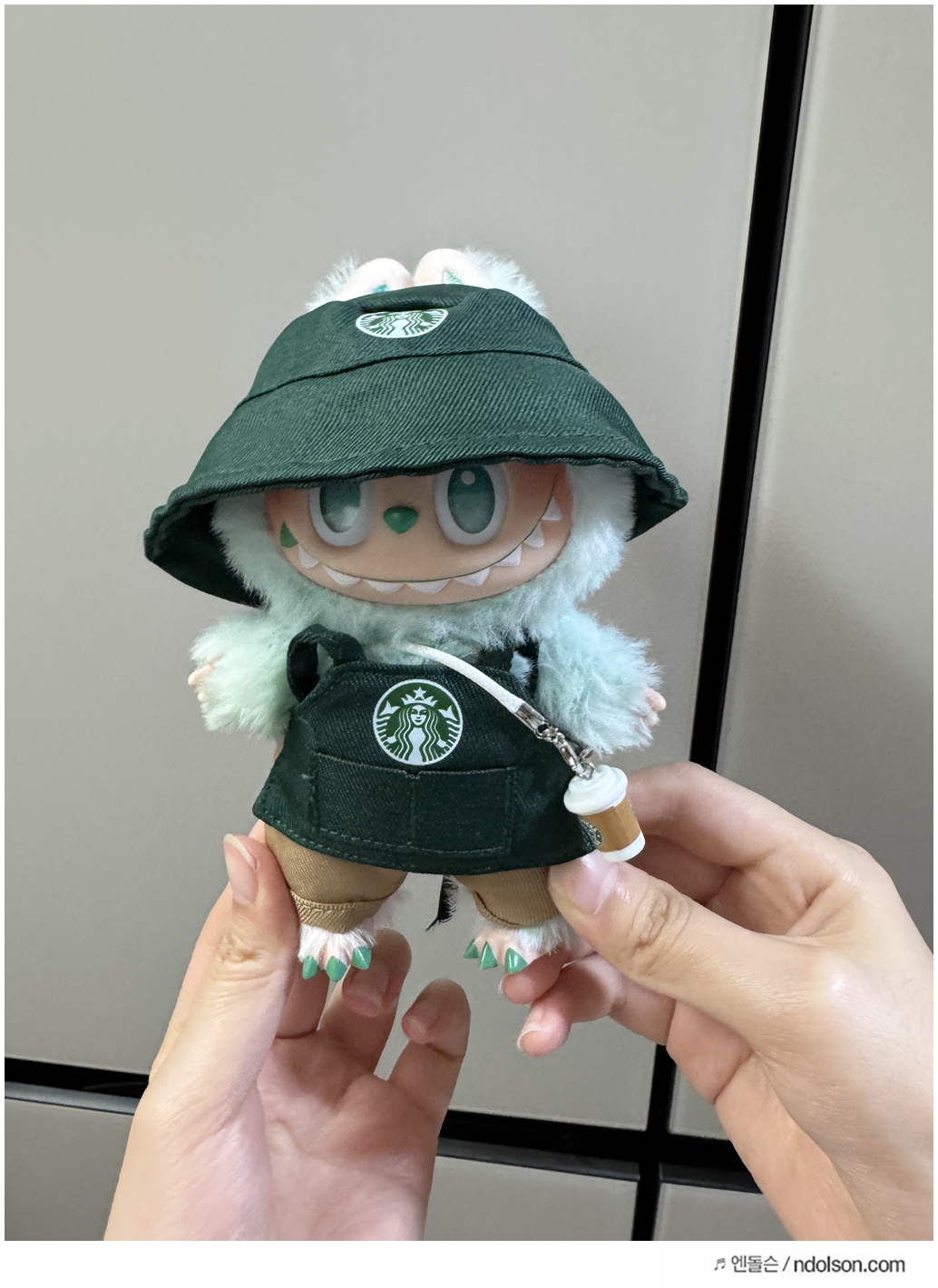 다음으로 선택한 의상은 스타벅스 콘셉트의 옷이었습니다. 초록색 앞치마와 블랙 톤의 상·하의로 구성된 이 옷은, 실제 스타벅스 직원 유니폼을 그대로 재현한 듯한 디테일이 돋보였습니다. 라부부 인형이 이 옷을 입으니 마치 카페에서 음료를 서빙하는 바리스타처럼 보였고, 보는 것만으로도 재미와 귀여움이 더해졌습니다.