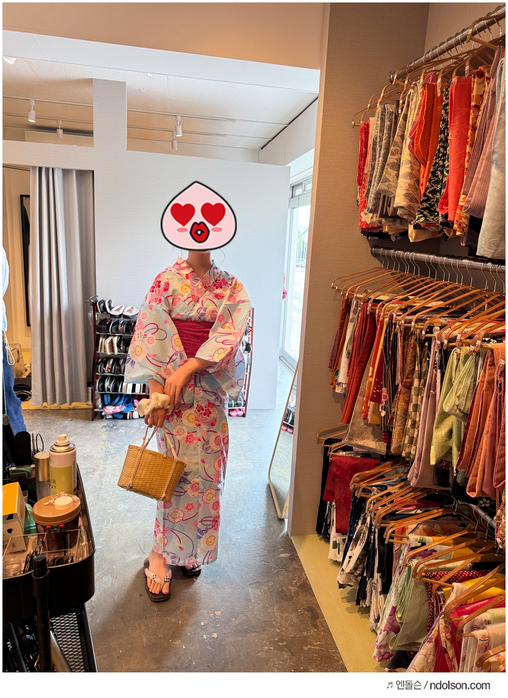 히비키에는 100종류가 넘는 기모노와 유카타가 준비되어 있으며, 디자인이 정말 다양하다. 전통적인 무늬부터 현대적인 감각의 패턴까지 고를 수 있어, 자신의 스타일에 맞는 기모노를 찾는 재미가 있었다. 입는 과정도 전문 스태프가 세심하게 도와주어 전혀 불편함이 없었다.