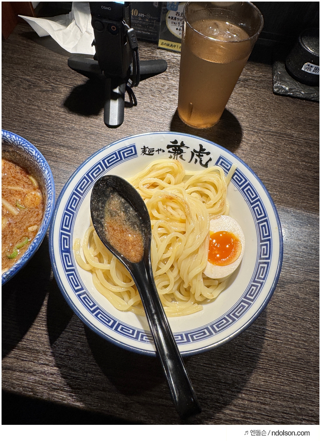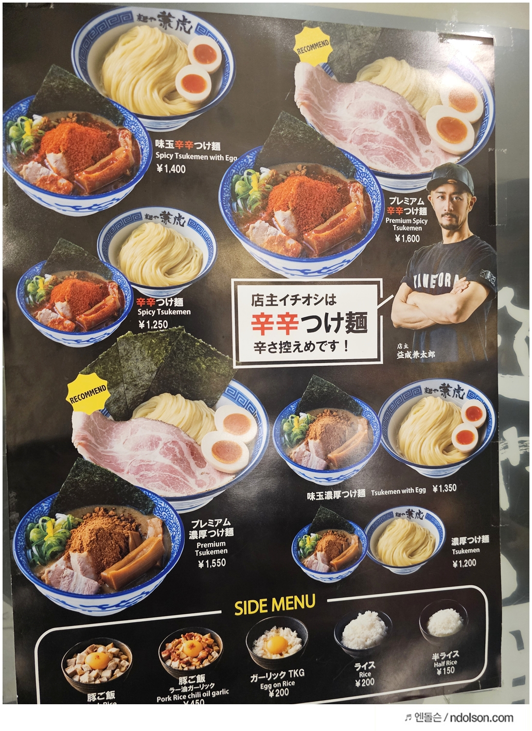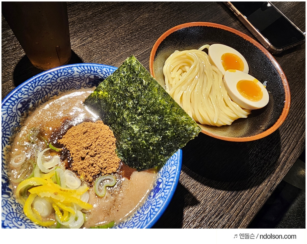 처음엔 평범한 라멘집인 줄 알았는데, 막상 먹어보니 츠케멘은 라멘과는 전혀 다른 매력이 있더군요. 면과 국물이 따로 나와서, 진한 육수에 면을 찍어 먹는 스타일입니다. 농후한 국물과 탱글탱글한 면의 조화가 정말 훌륭했어요. 와이프가 특히 좋아하더라고요. 매운맛을 선택할 수 있었는데, 우리는 중간 단계로 주문했어요. 한국인 입맛에도 딱 맞는 적당한 매운맛이었습니다.
