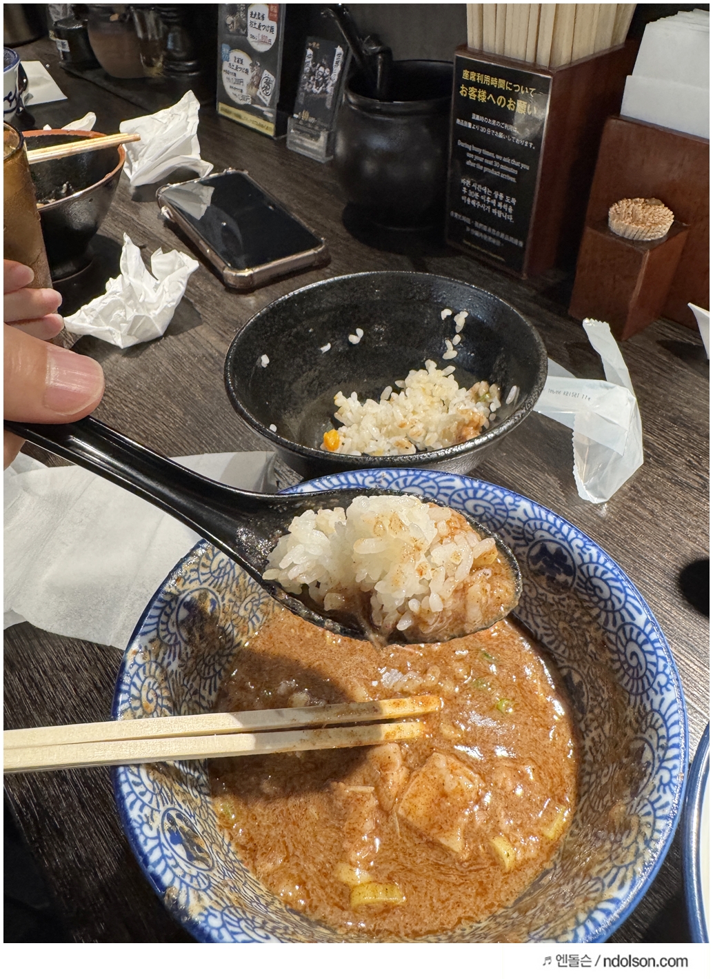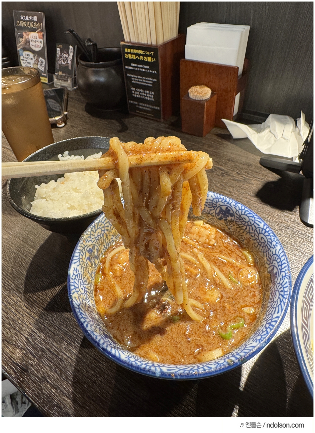 드디어 자리로 안내받고 주문한 스파이시 츠케멘 위드 차슈가 나왔습니다. 비주얼부터가 예술이에요. 국물은 걸쭉하고 진한데, 한입 찍어 먹자마자 매운맛과 감칠맛이 동시에 확 퍼집니다.