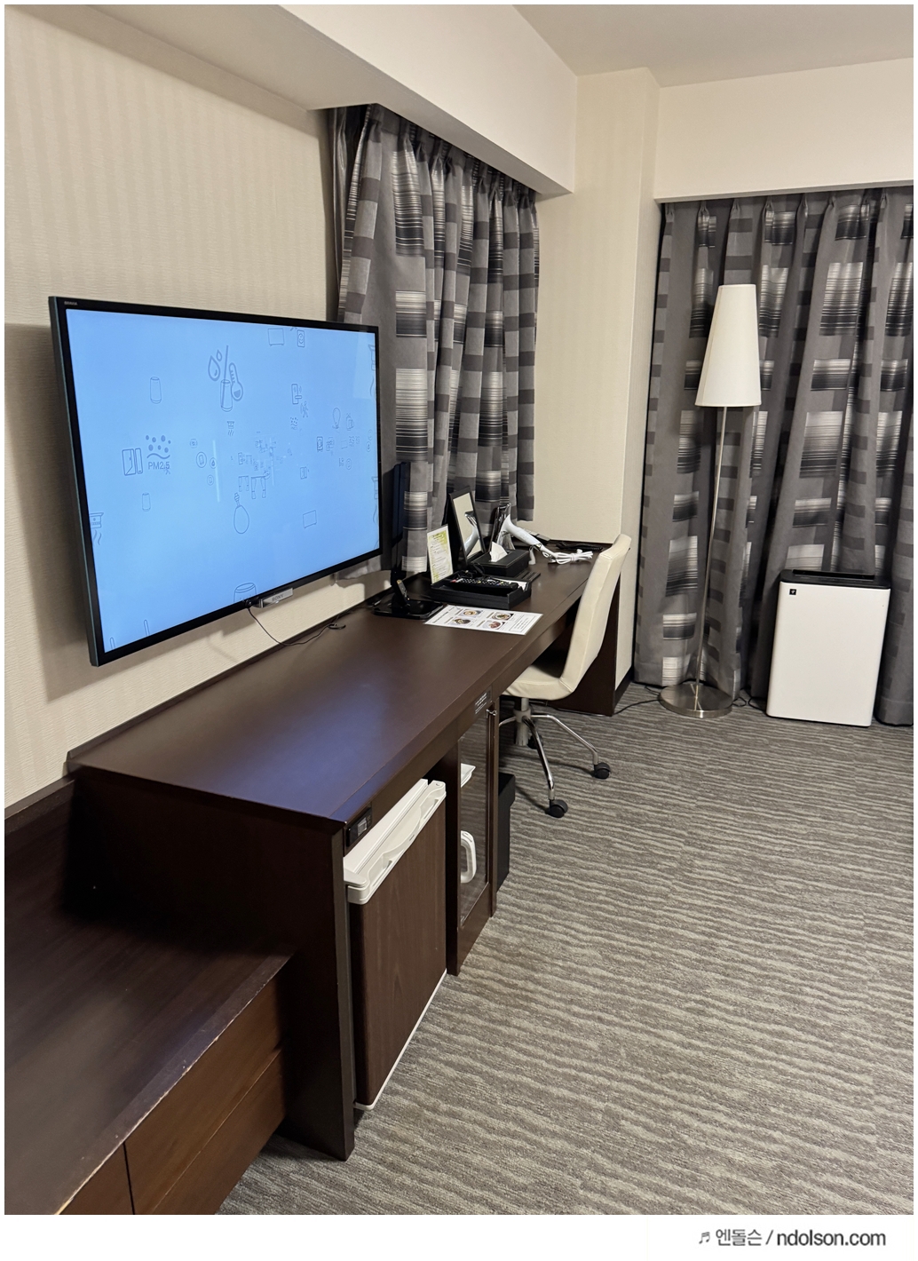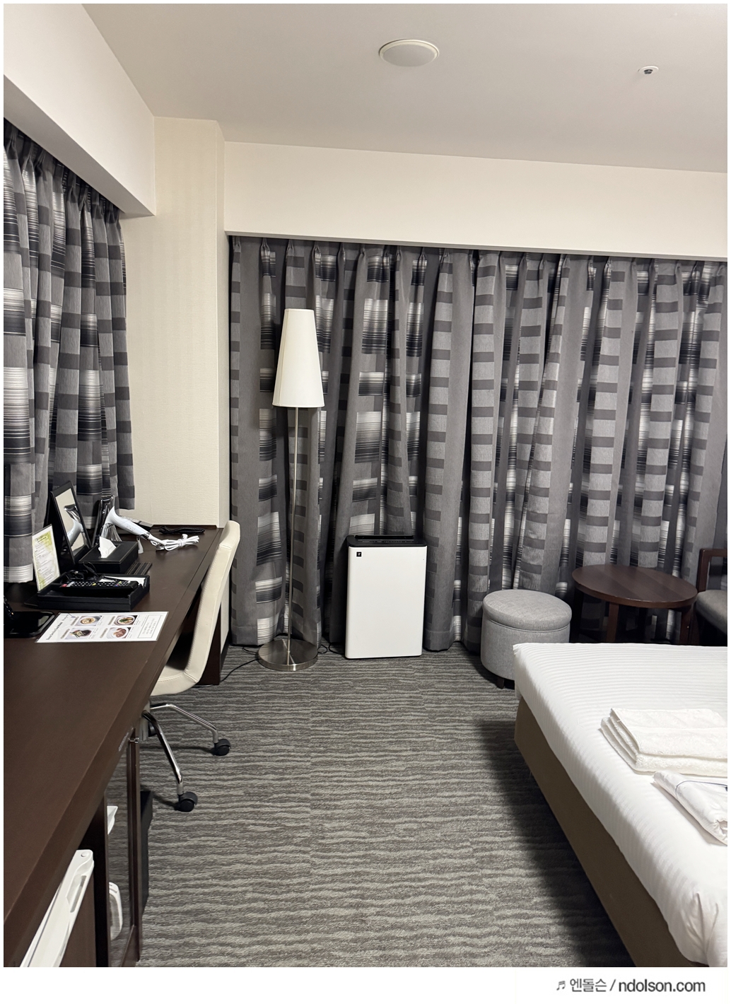 이 호텔의 가장 큰 장점은 초등학생 무료 숙박이 가능하다는 점이에요. ‘곁잠’이 가능한 넓은 침대가 있어서, 트윈룸 침대를 붙이면 3인 가족이 충분히 잘 수 있습니다. 방 크기도 여유로워서 캐리어 3개를 펴두고 짐 정리하기에도 전혀 불편하지 않았습니다. 후쿠오카 시내 중심 호텔 중에서는 드물게 가족 단위 투숙객에게 딱 맞는 구조예요.