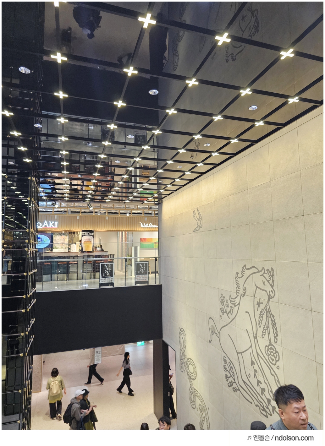 이곳의 하이라이트는 단연 건물 앞 광장에 설치된 ‘픽셀나무’ 조형물이었습니다. 높이 약 10m에 달하는 이 나무는 시멘트 재질의 구조물로, 나무의 잎사귀와 줄기를 픽셀처럼 네모난 형태로 표현한 독특한 디자인입니다. 작가 레안드로 에를리치(Leandro Erlich)의 작품으로, 현실과 디지털 세계가 융합된 예술적 감각이 돋보였어요.