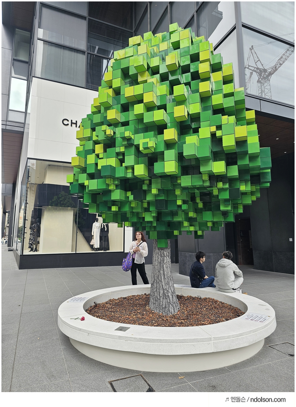 이곳의 하이라이트는 단연 건물 앞 광장에 설치된 ‘픽셀나무’ 조형물이었습니다. 높이 약 10m에 달하는 이 나무는 시멘트 재질의 구조물로, 나무의 잎사귀와 줄기를 픽셀처럼 네모난 형태로 표현한 독특한 디자인입니다. 작가 레안드로 에를리치(Leandro Erlich)의 작품으로, 현실과 디지털 세계가 융합된 예술적 감각이 돋보였어요.