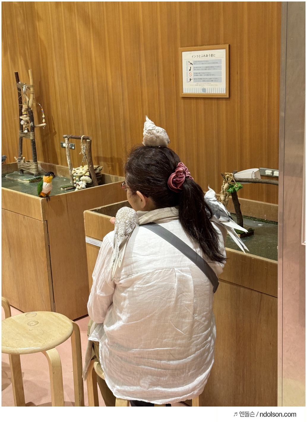 앵무새가 먹이를 보면 환장해서 사람 머리로 올라옵니다. ㅋㅋ 그런데 딸아이 머리에서 똥을 쌌네? 일본 직원에게 설명하고 물티슈를 받아서 머리를 급하게 닦았네요. 추억이지만, 그녀석만 똥 쌌어요. 다른 녀석들은 손에서도 얌전했는데, 미치겠네요.
