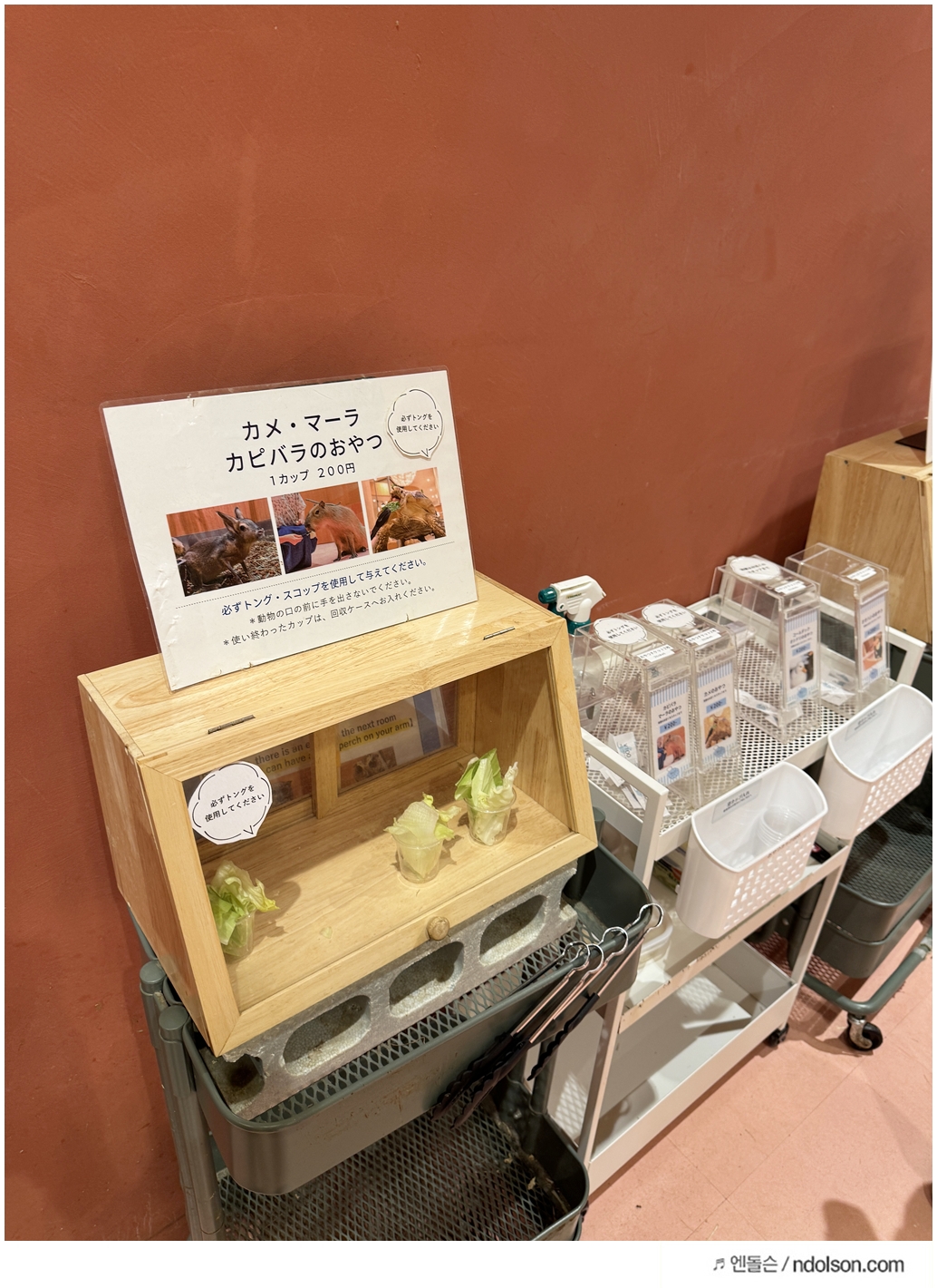 먹이 체험은 100엔 쿠폰 두 장 세트로 이용할 수 있었는데, 쿠폰을 통에 넣고 먹이를 교환하는 방식이라 간편했습니다. 덕분에 여러 번 체험할 수 있어 아이가 매우 만족해했습니다.