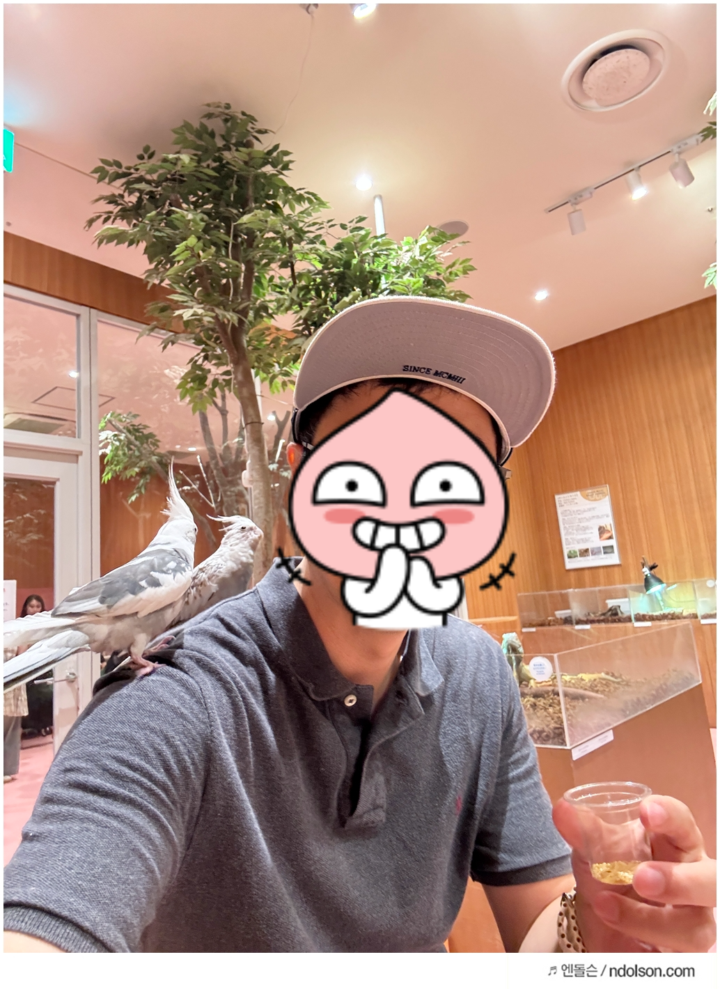 저희는 앵무새 체험을 마친 후 음료를 마시며 잠시 휴식을 취했습니다. 아이는 동물들을 구경하며 웃음이 끊이지 않았습니다.