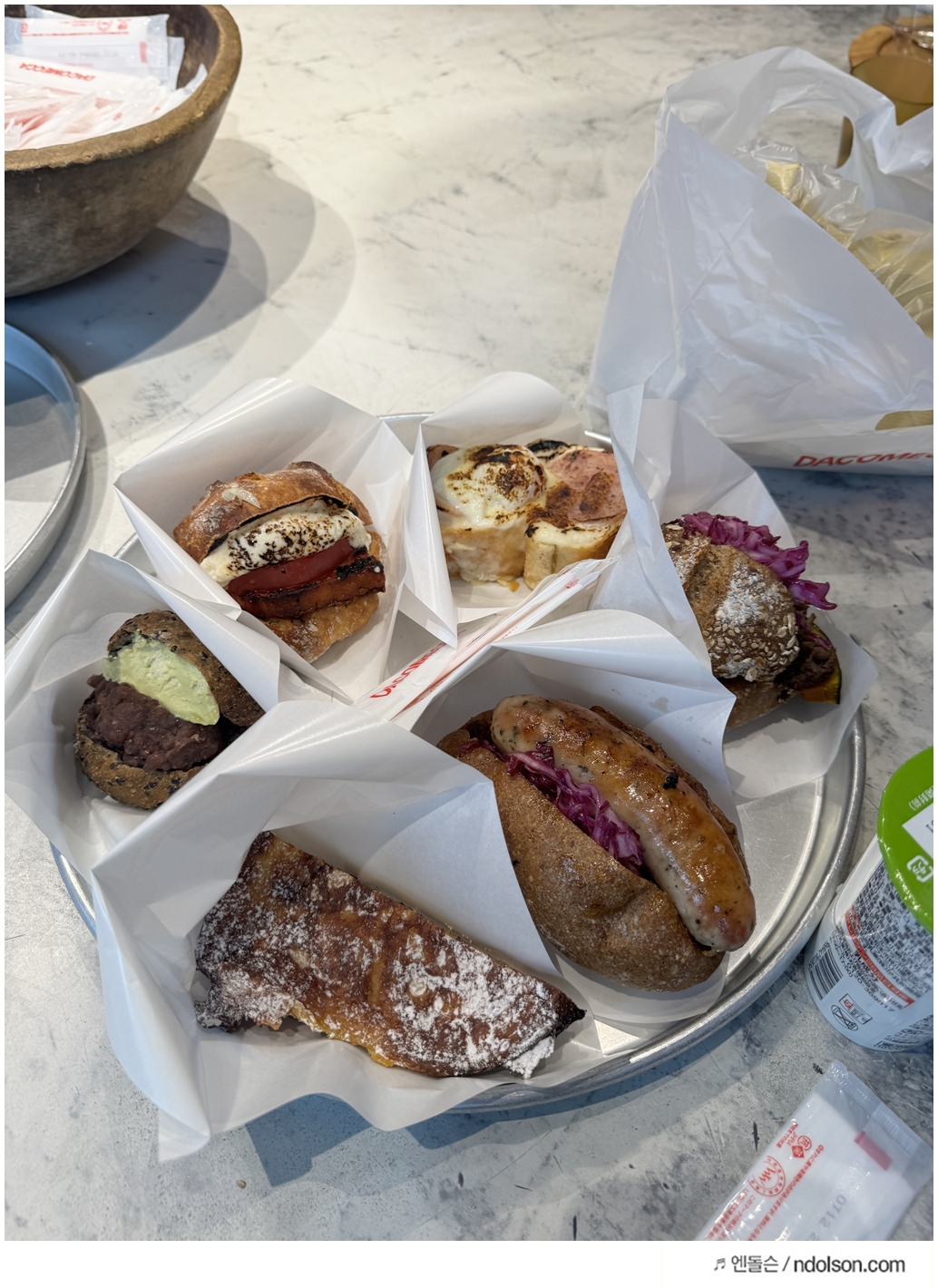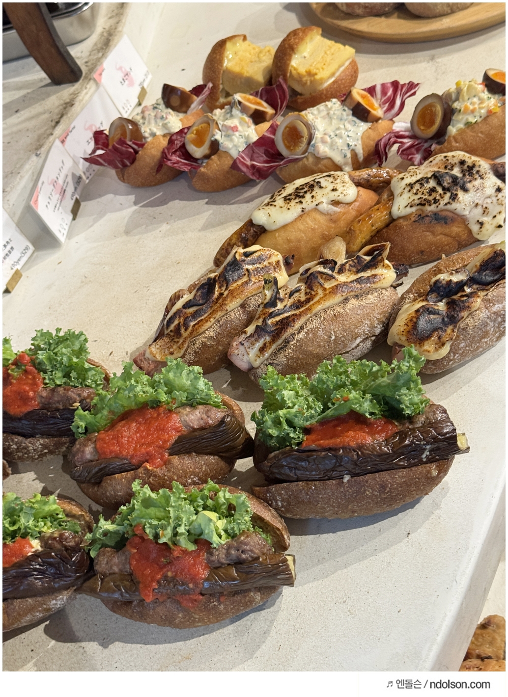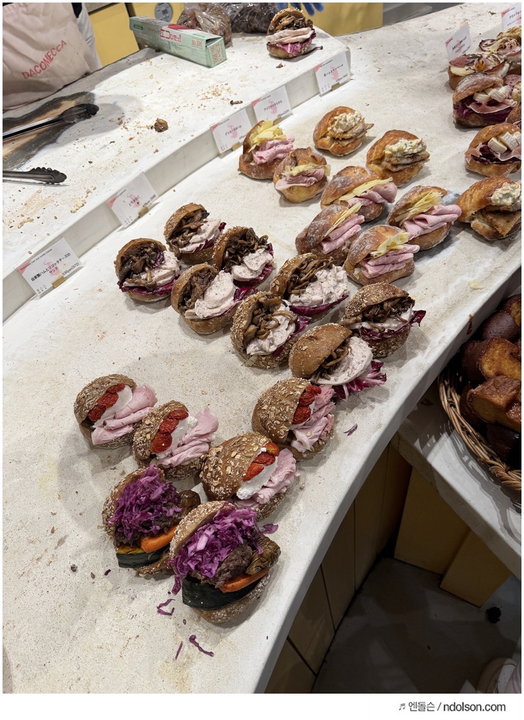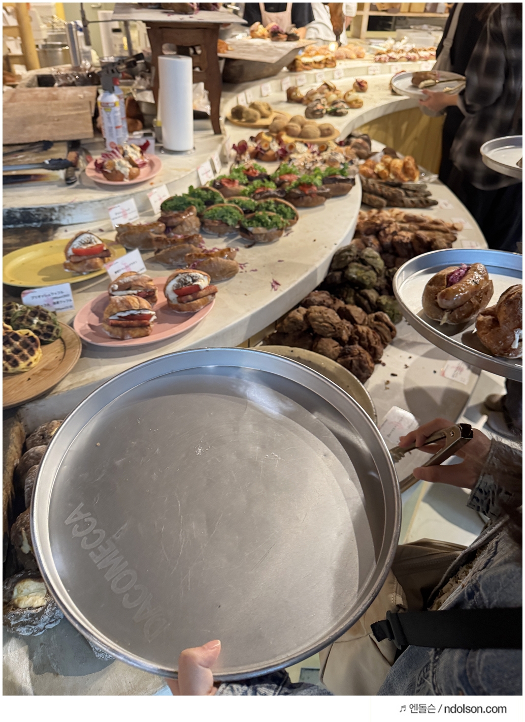 드디어 입장 후, 다양한 빵을 고르기 시작했습니다. 아내는 다코멧카의 시그니처인 명란 토마토 바게트를 선택했는데, 다른 곳에서는 보기 힘든 독특한 조합이었습니다. 짭조름한 명란과 부드러운 토마토 소스가 바게트와 잘 어울려 정말 맛있었습니다.
