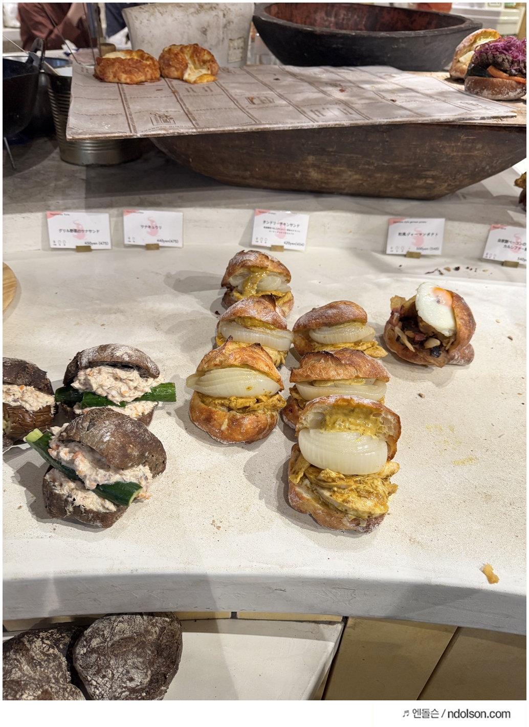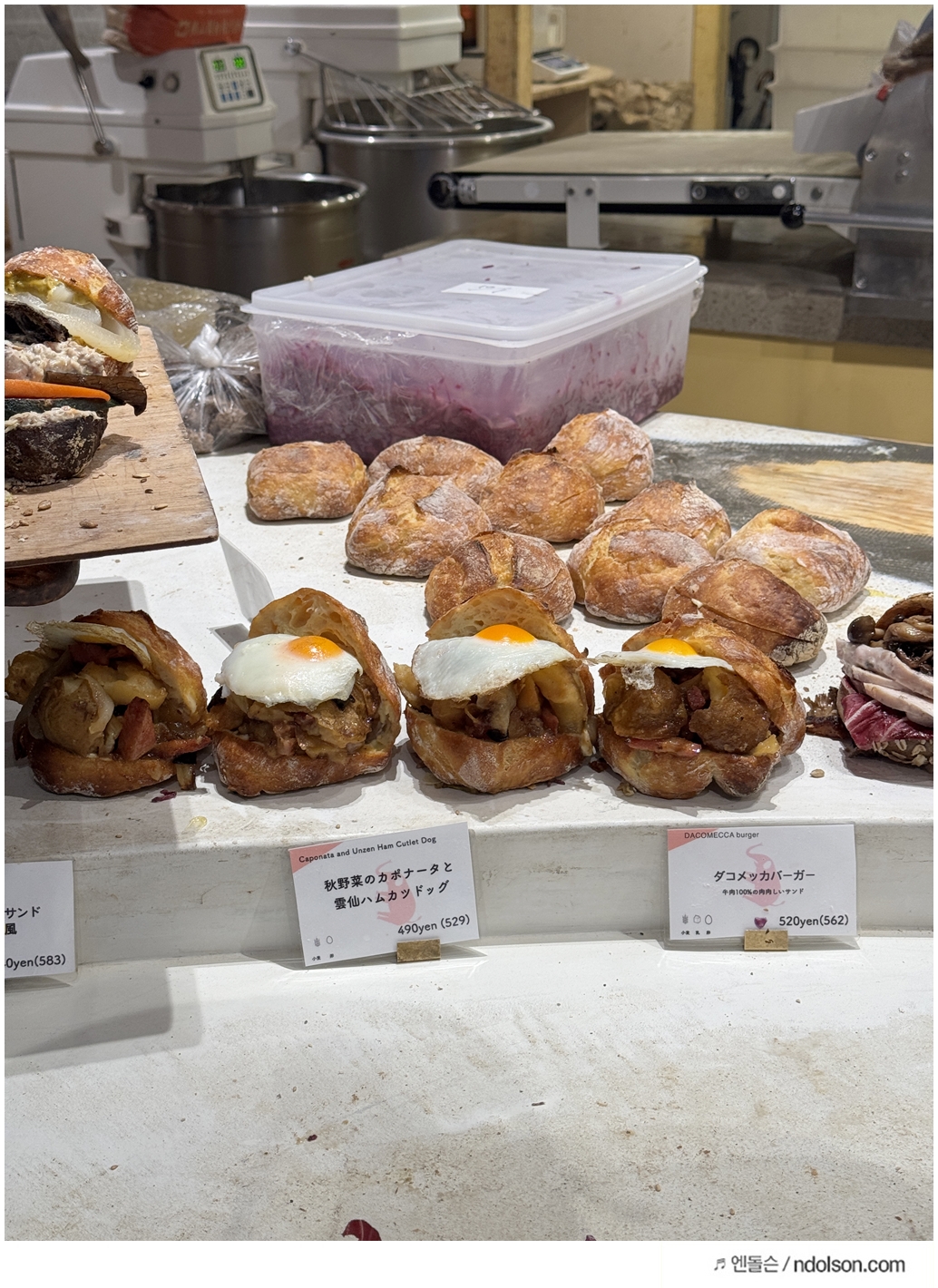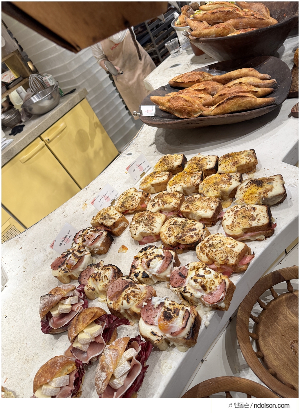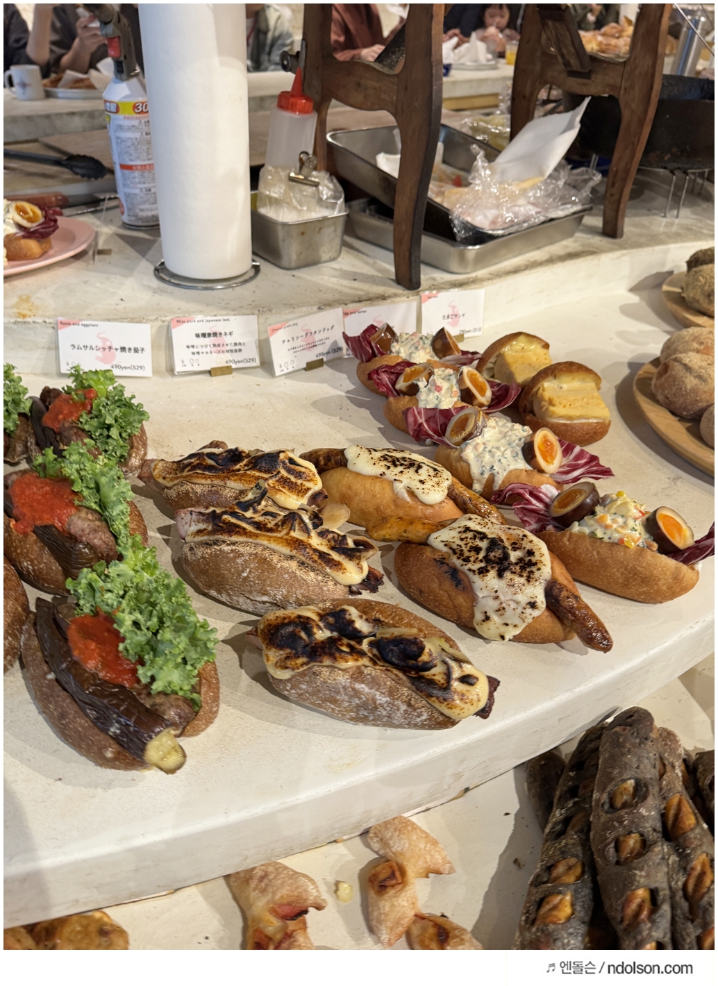 드디어 입장 후, 다양한 빵을 고르기 시작했습니다. 아내는 다코멧카의 시그니처인 명란 토마토 바게트를 선택했는데, 다른 곳에서는 보기 힘든 독특한 조합이었습니다. 짭조름한 명란과 부드러운 토마토 소스가 바게트와 잘 어울려 정말 맛있었습니다.