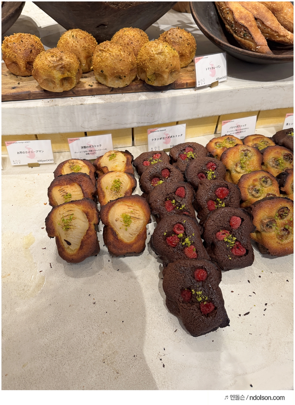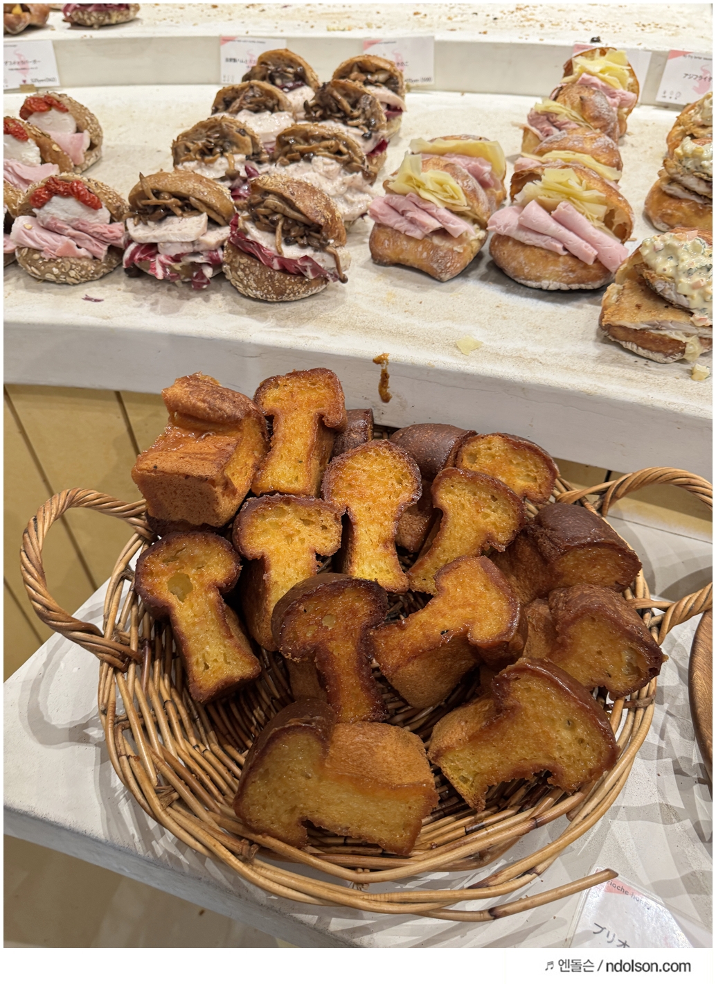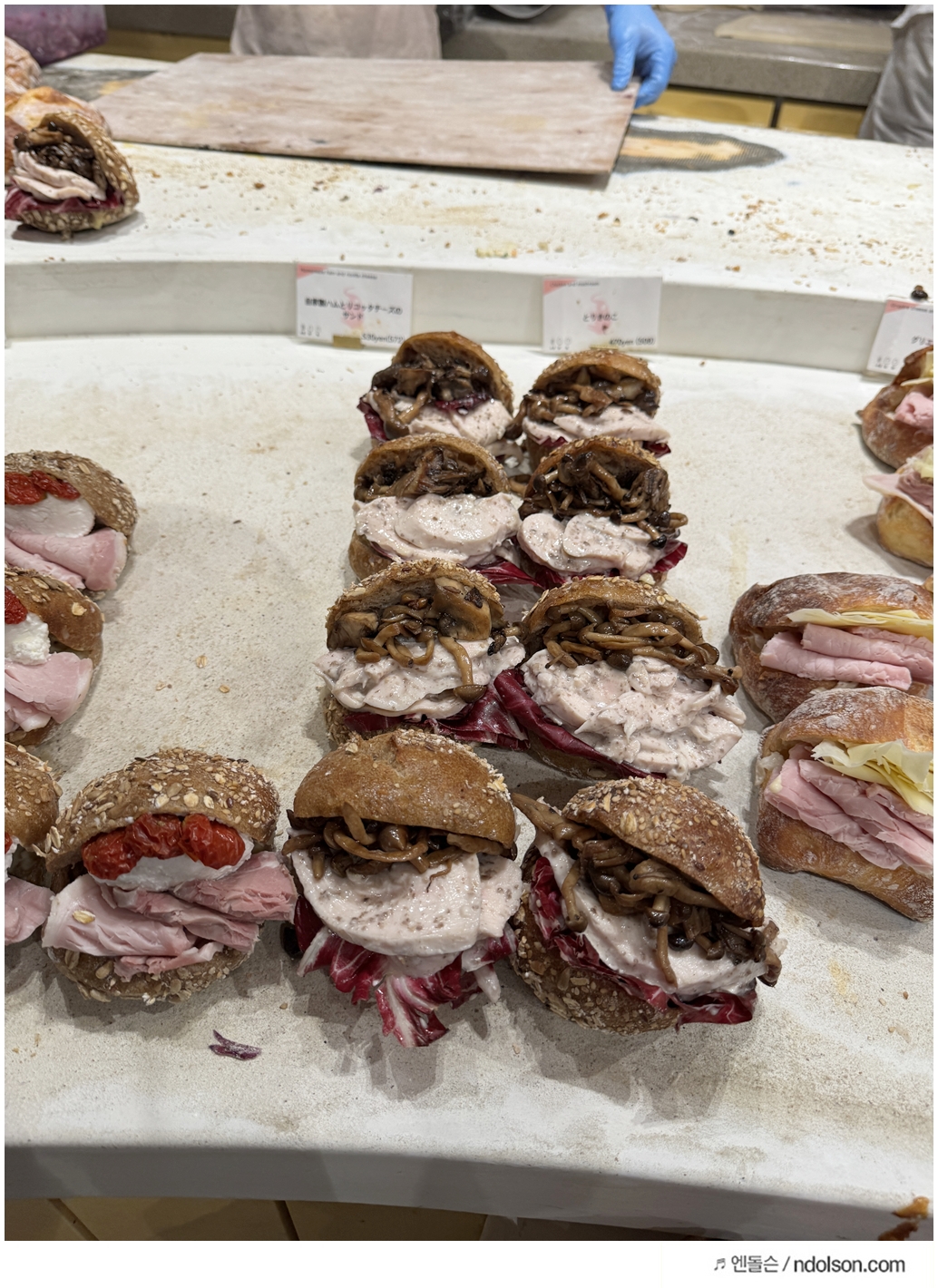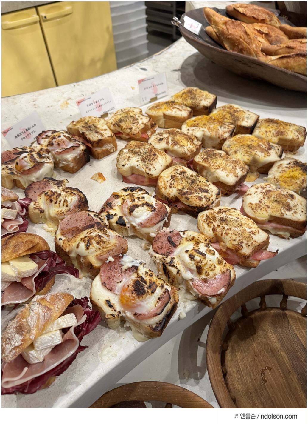 드디어 입장 후, 다양한 빵을 고르기 시작했습니다. 아내는 다코멧카의 시그니처인 명란 토마토 바게트를 선택했는데, 다른 곳에서는 보기 힘든 독특한 조합이었습니다. 짭조름한 명란과 부드러운 토마토 소스가 바게트와 잘 어울려 정말 맛있었습니다.