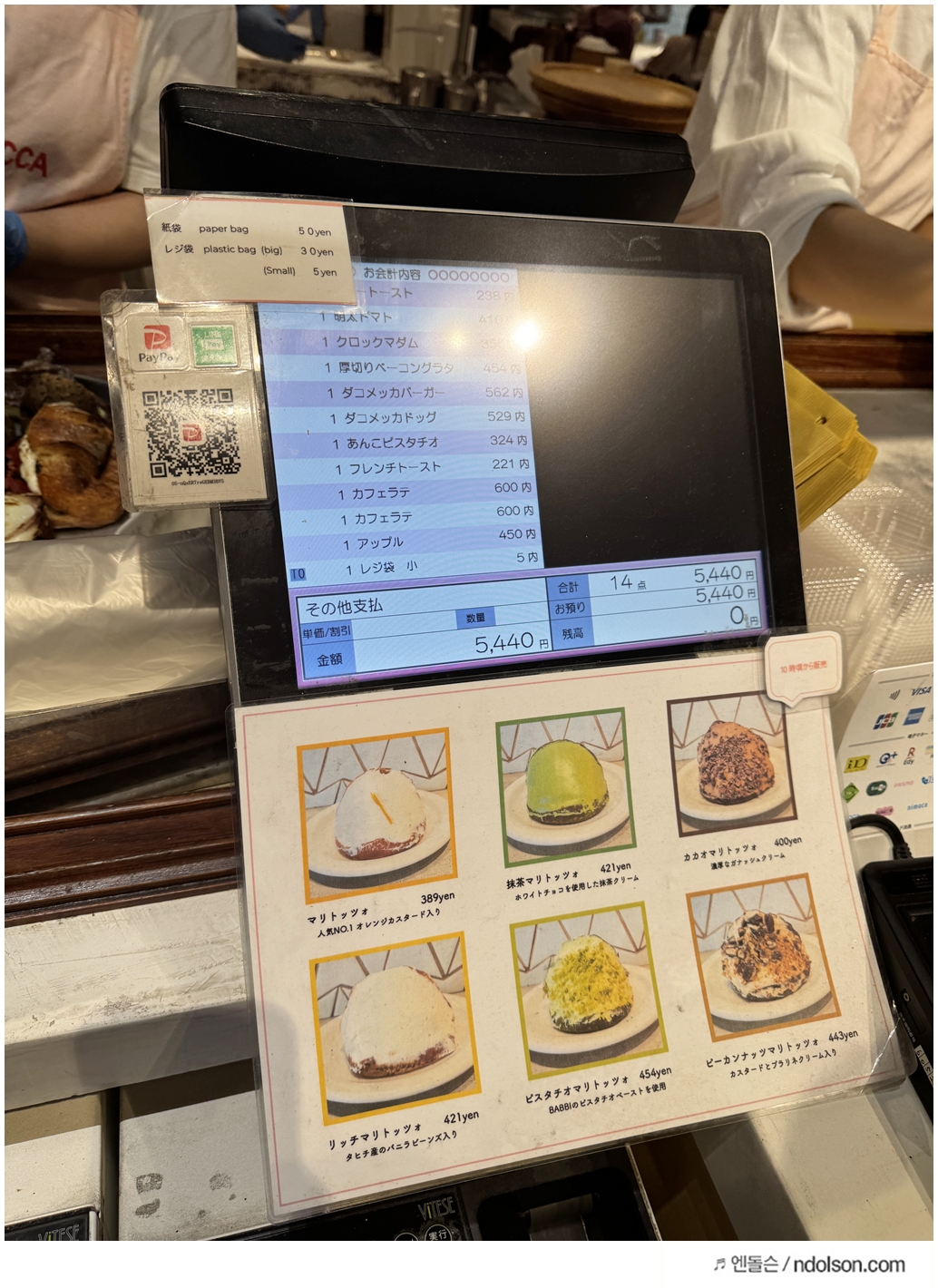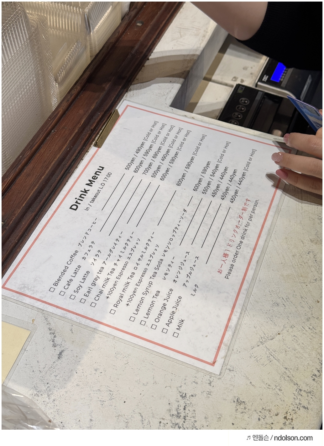 가격대는 빵이 300~600엔, 음료는 450~600엔 정도로, 후쿠오카의 다른 카페들에 비해 가성비가 좋은 편입니다. 결제는 현금, 카드, PayPay 등 모두 가능했습니다.