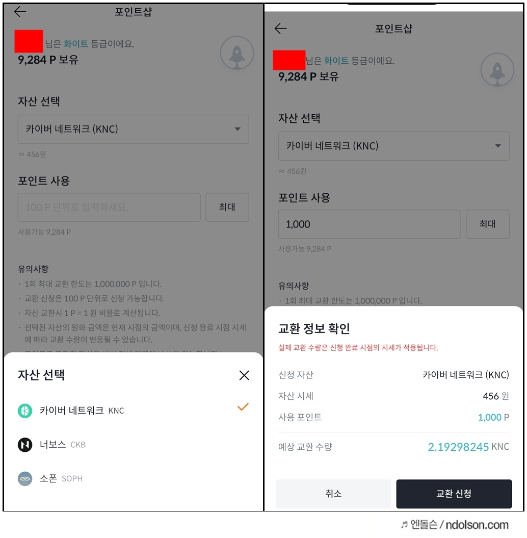 - 포인트샵에서 ‘KNC 코인 교환’ 선택