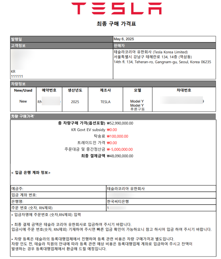 테슬라 모델 Y RWD는 환경부의 전기차 보조금 대상 차량으로, 국가 보조금 188만 원, 서울시 지자체 보조금 최대 630만 원이 적용된다. 단, 지역별 예산 상황에 따라 차이가 있으며, 하반기에는 보조금 예산이 조기 소진되는 경우도 많다. 실제 결제서 기준으로 KR Govt EV Subsidy 항목에 -2,620,000원이 명시되어 있다.