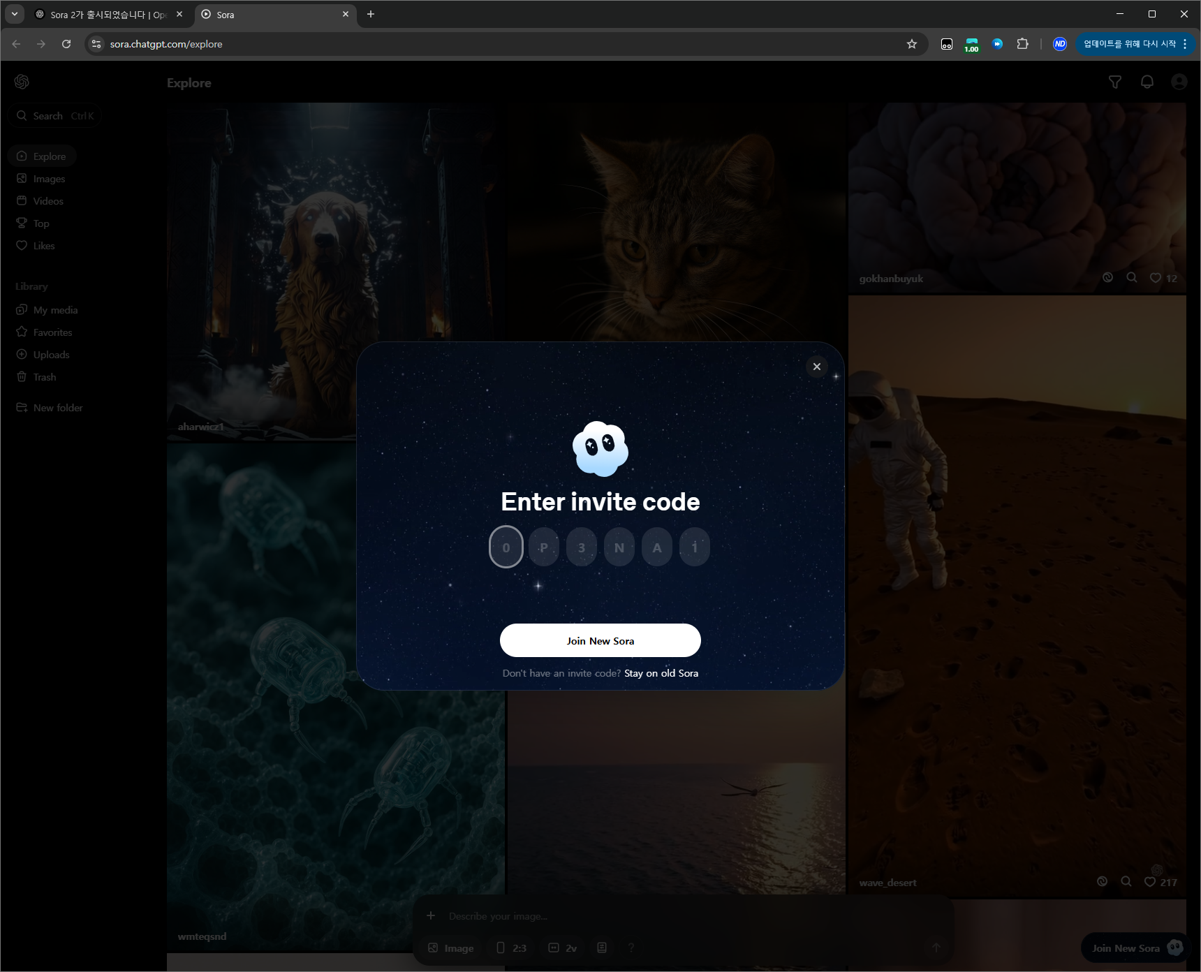 - 새 초대 코드가 게시되면 즉시 복사하여 Sora 2 웹페이지 로그인 창에 입력