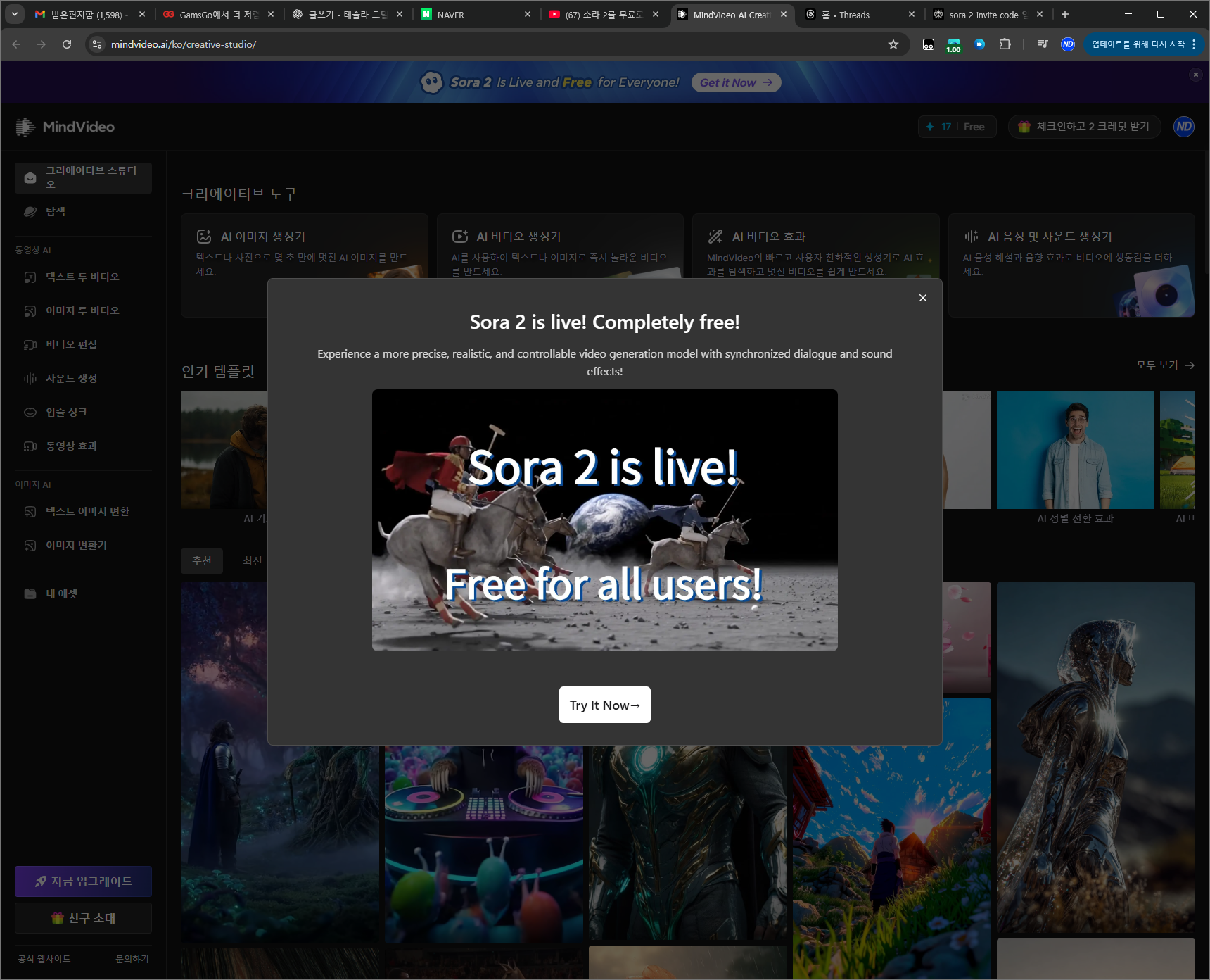 이 중 MindVideo는 실제로 “Sora 2 is live! Free for all users!”라는 팝업을 통해 초대 코드 없이 누구나 바로 사용할 수 있는 점에서 접근성이 가장 높습니다.