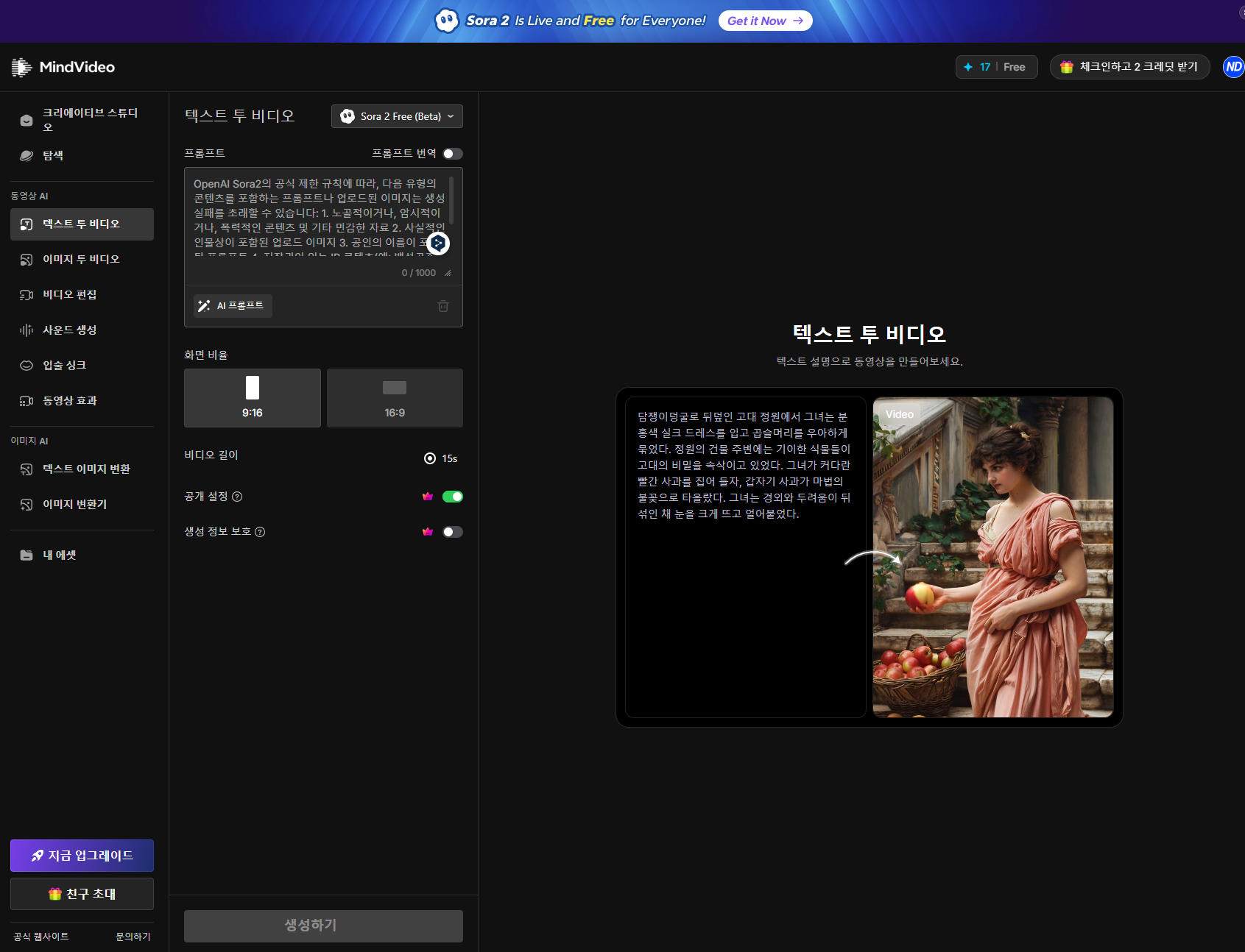 이 중 MindVideo는 실제로 “Sora 2 is live! Free for all users!”라는 팝업을 통해 초대 코드 없이 누구나 바로 사용할 수 있는 점에서 접근성이 가장 높습니다.
