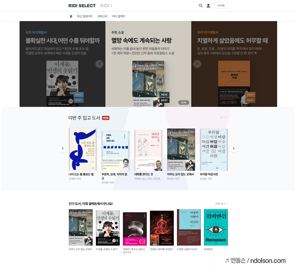 요즘 저는 리디셀렉트(RIDI Select)를 이용해 전자책을 꾸준히 읽고 있습니다. 올해만 해도 여러 권의 책을 완독했는데, 특히 이세돌 인생의 수 읽기 같은 도서가 인상 깊었습니다. 무엇보다 태블릿 하나에 수백 권의 책이 담겨 있다는 사실이 정말 편리했습니다.