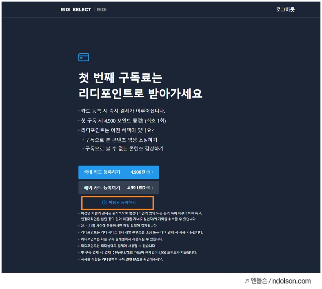 리디셀렉트 정가는 월 4,900원이지만, 1천원 더 싸게 월구독할 수 있습니다. 유플러스 등 다른 방법도 있지만, 이게 제일 편하고 저렴하게 구매할 수 있습니다.