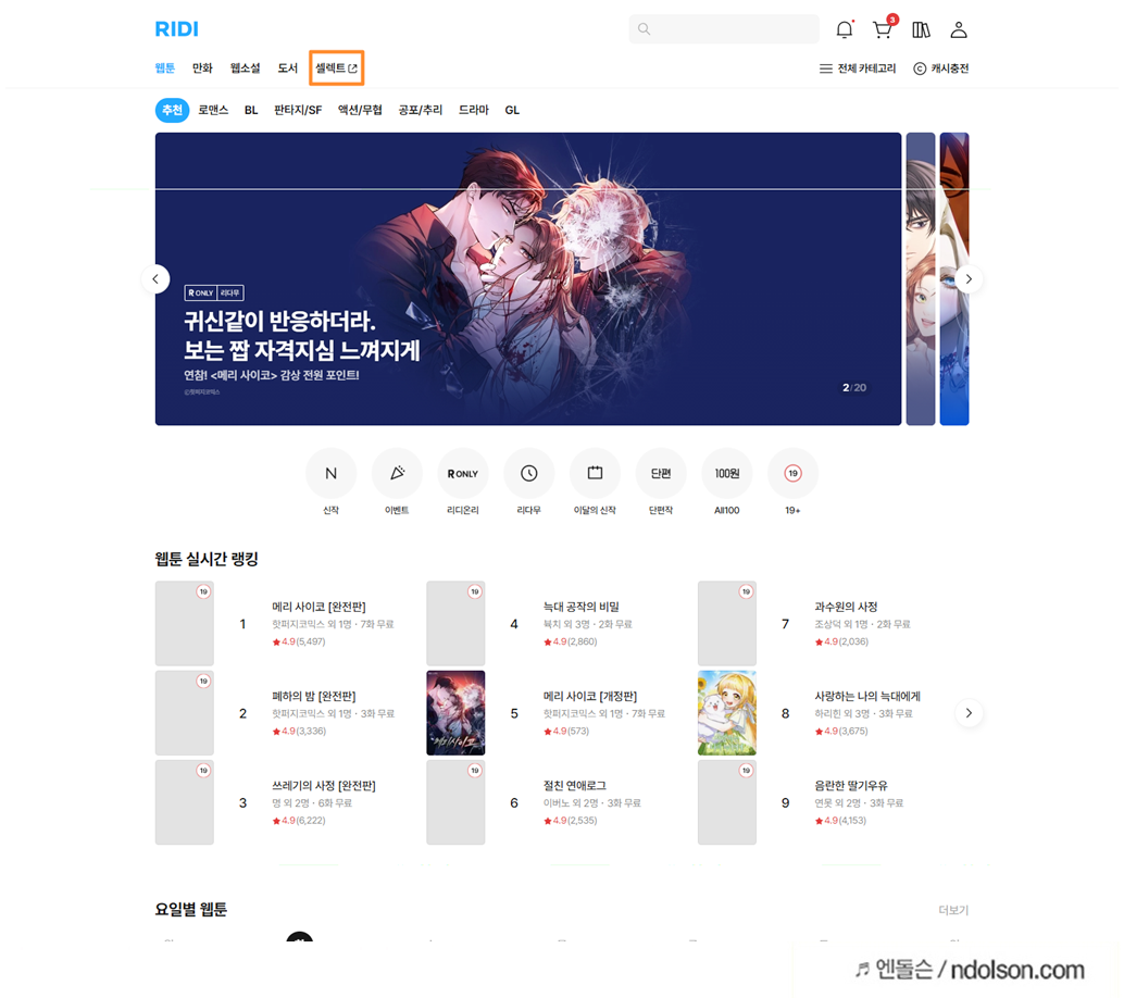 PC에서 리디셀렉트 사이트에 접속합니다.