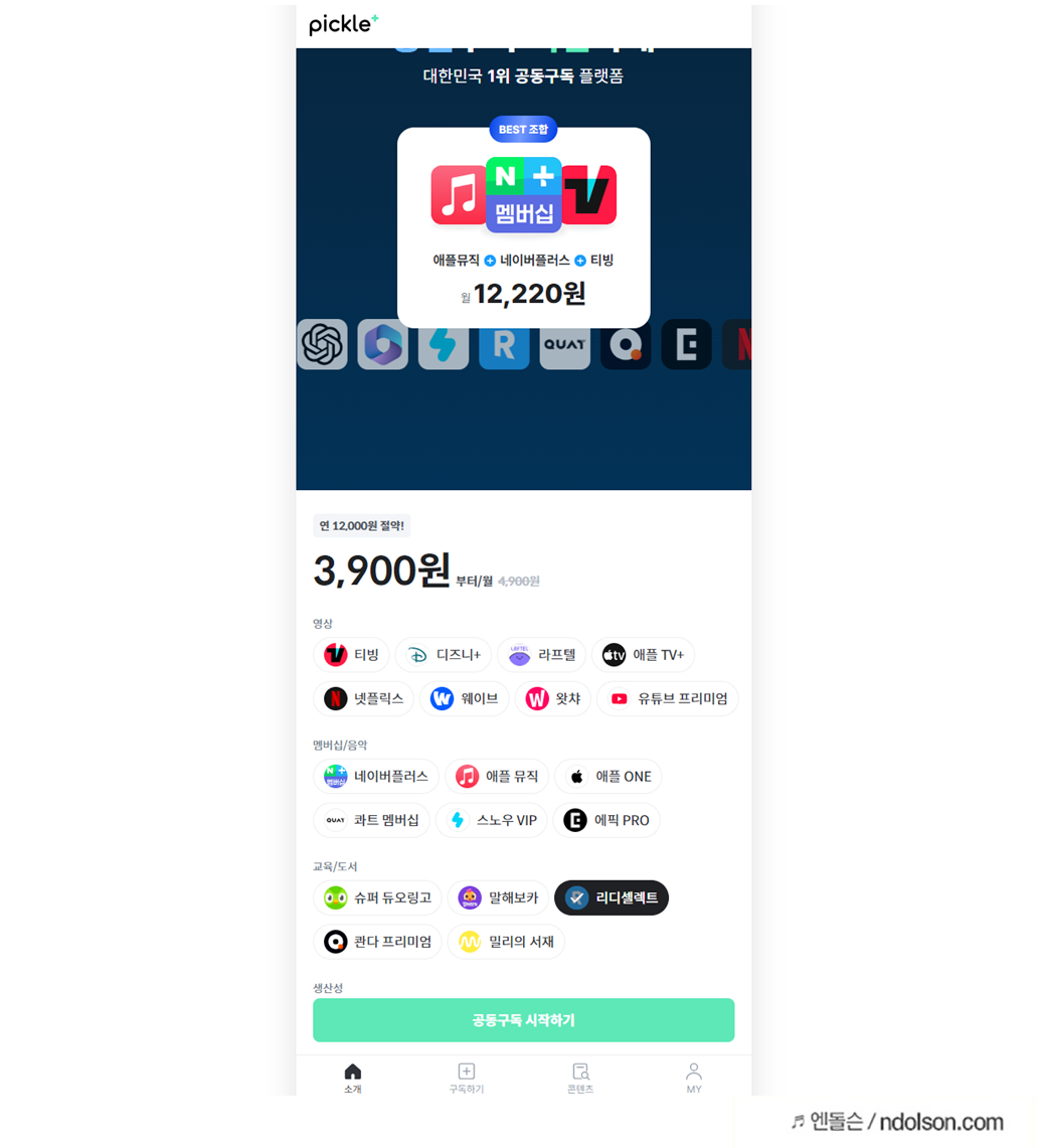 위의 공동구독 플랫폼인 피클플러스에 가입을 합니다.
