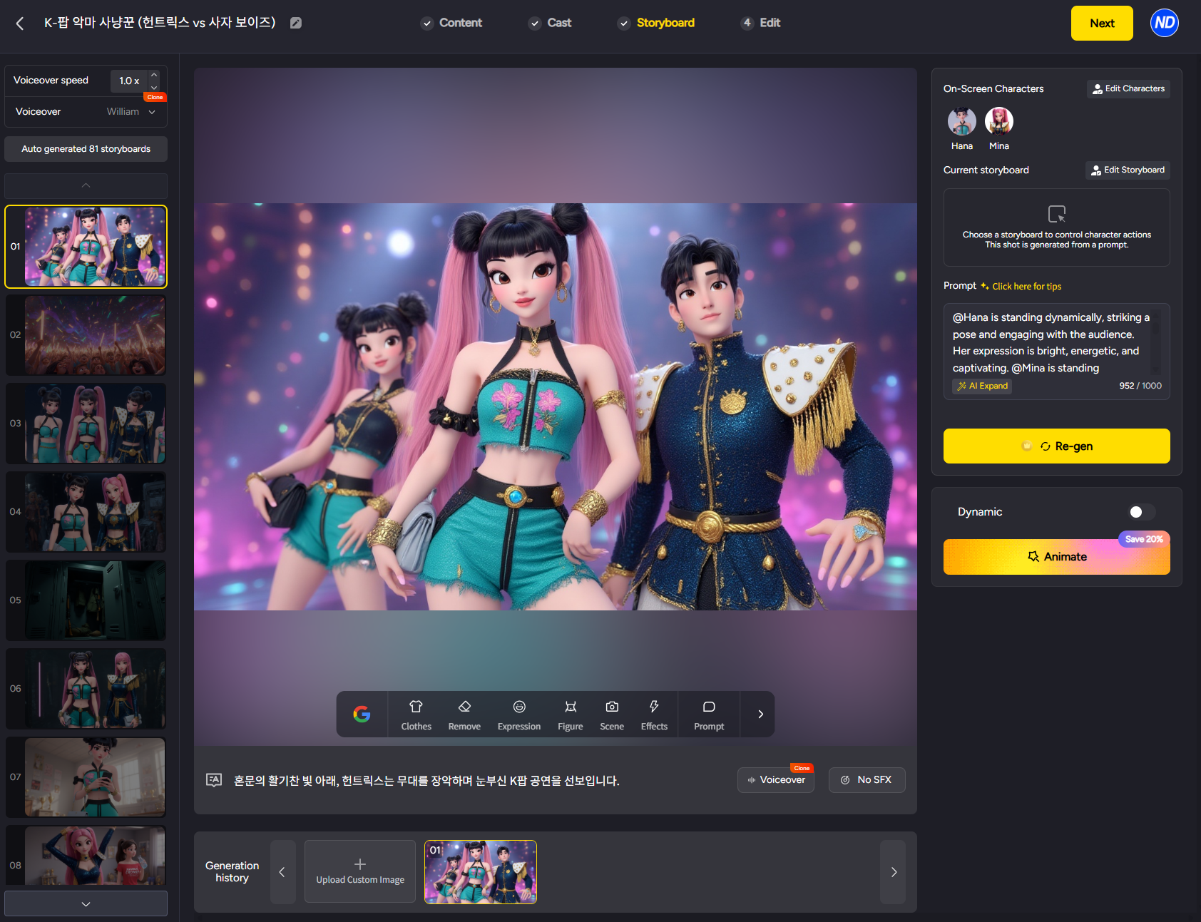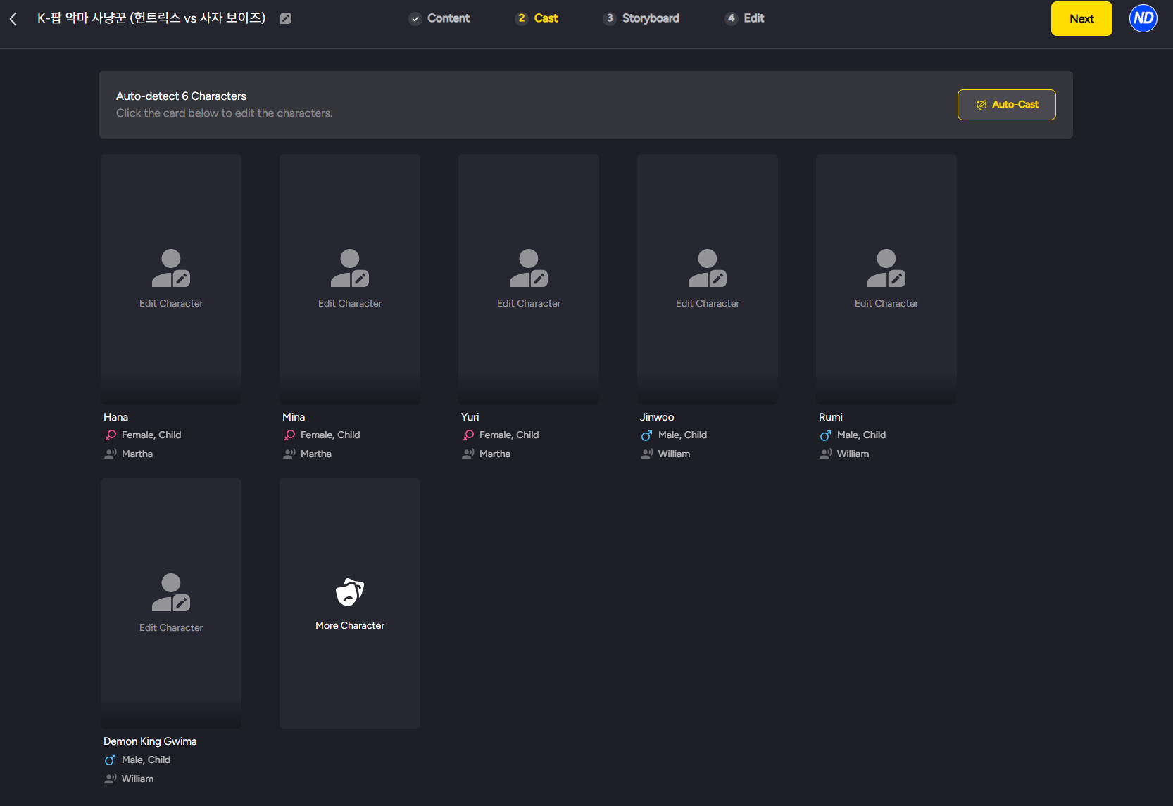 특히 “AutoCast”라는 기능을 통해 AI가 스토리와 분위기에 맞는 캐릭터를 자동 추천해주는 부분이 편리했습니다.
