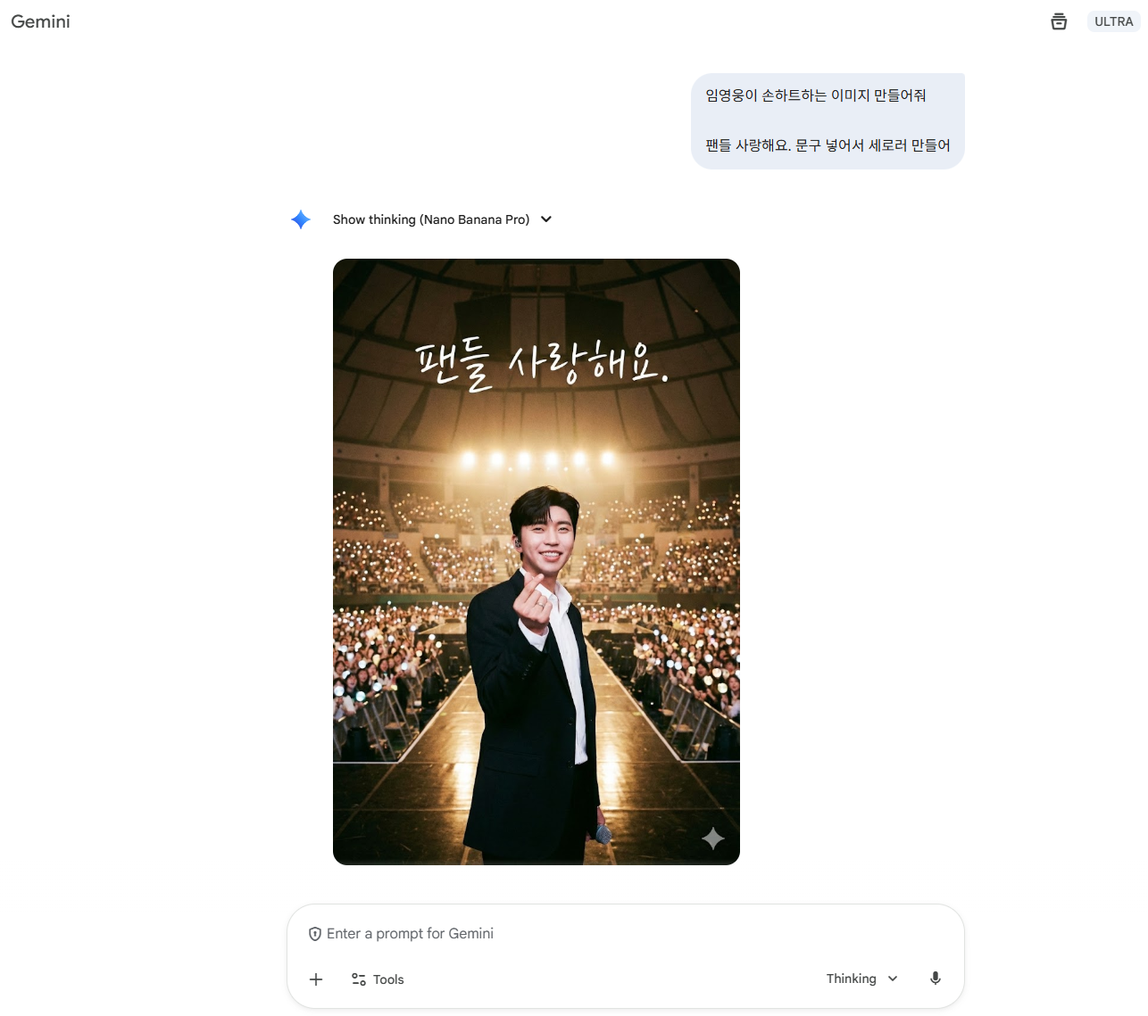 임영웅 팬인 장모님을 위해서 구글 제미나이 AI가 무엇인지 보여 드렸습니다. 나노바나나가 이렇게 쉽게 임영웅을 주무른다(?)고 알려드렸습니다. 손하트도 날려 드리고요~