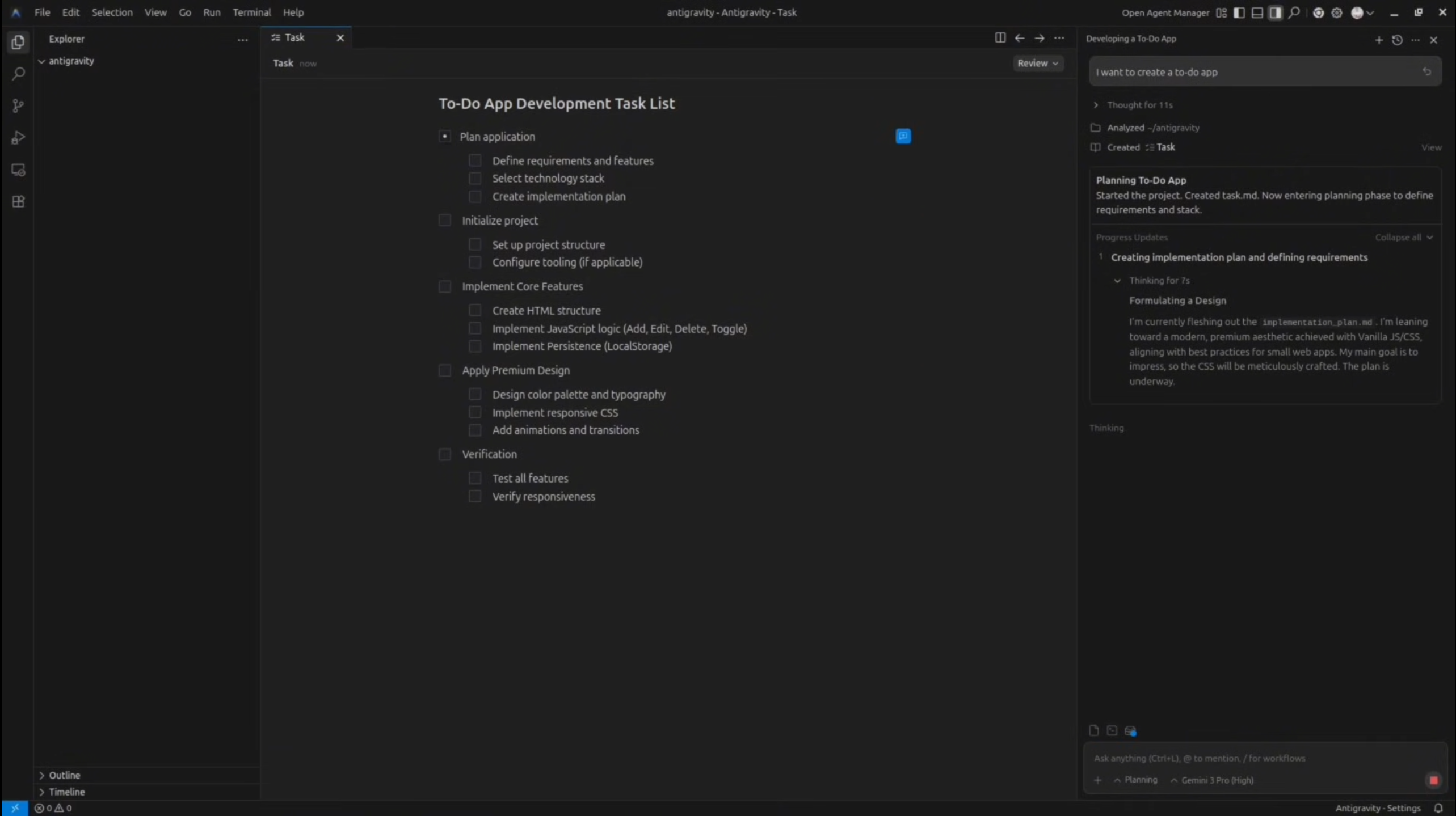 기존의 AI 코딩이 "이 함수 짜줘"라고 하면 코드를 뱉어내는 식이었다면, 안티그래비티는 "이 기능 구현해줘"라고 하면 계획을 세우고, 코드를 짜고, 터미널을 열어 실행하고, 브라우저를 띄워 테스트까지 수행합니다.