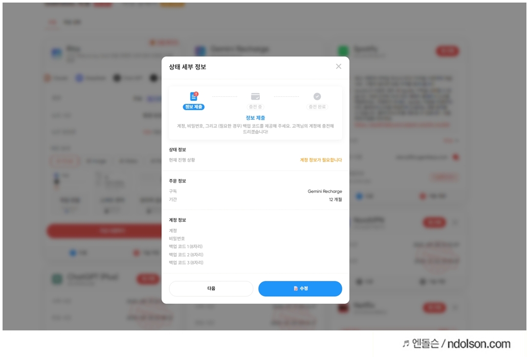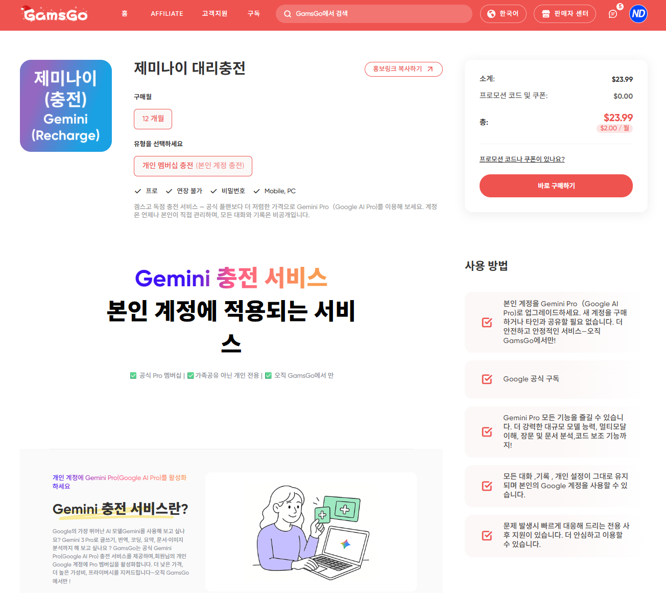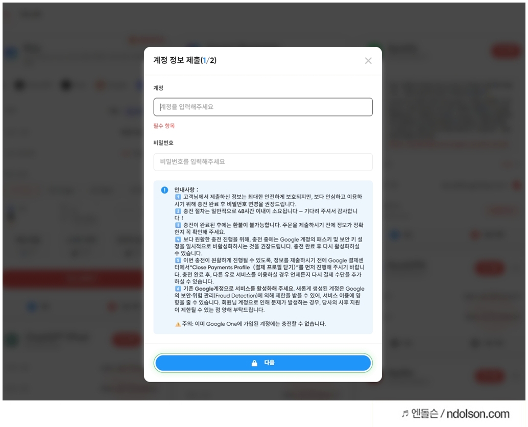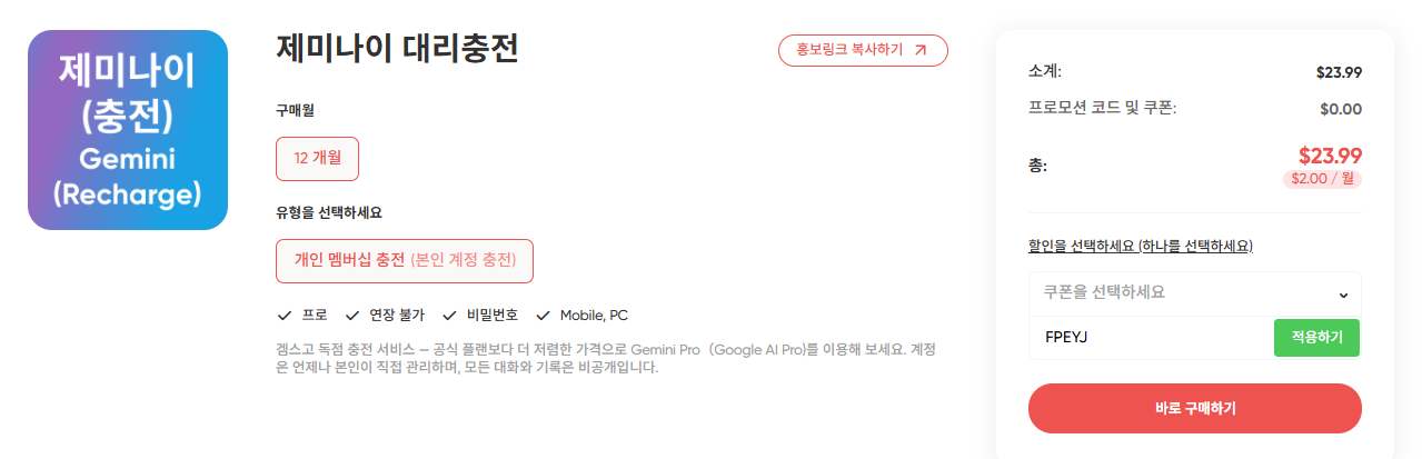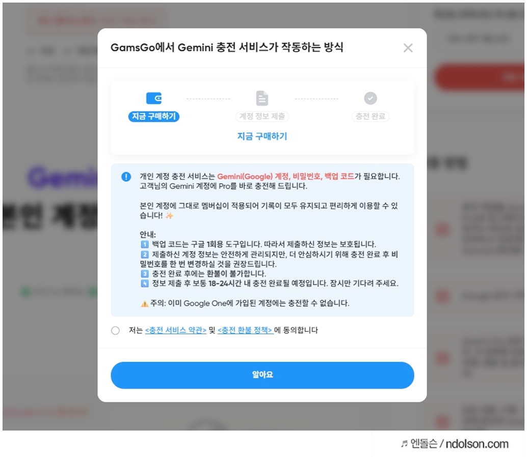 그런데 구글 제미나이 AI 대리충전은 내 계정에 저렴하게 충전하는 서비스로 조건과 동의가 필요합니다.