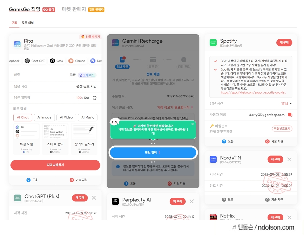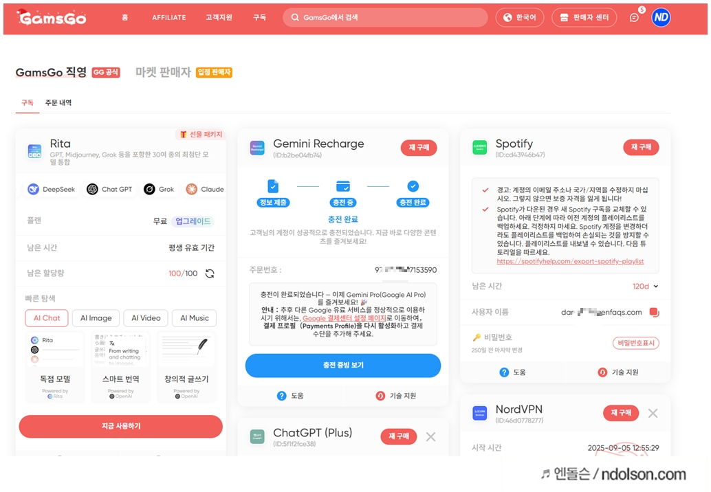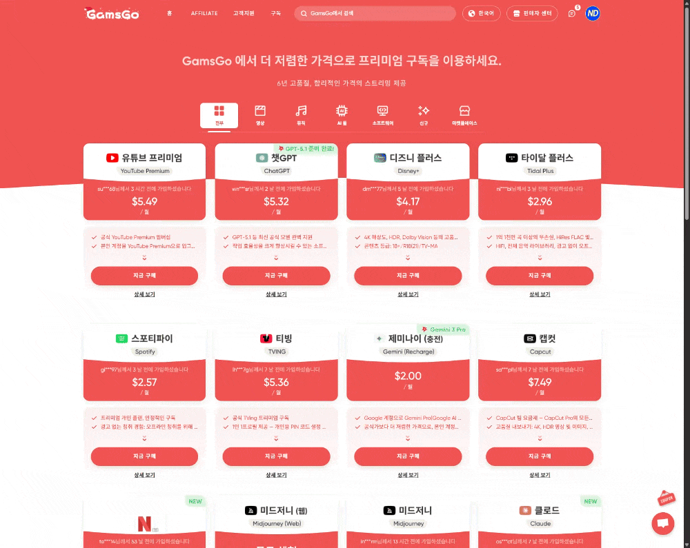 단 3년 만에 전 세계 100만 명 이상의 이용자를 확보하며 글로벌 시장에서 빠르게 성장한 서비스입니다. 겜스고의 강점은 비용 분담 모델로 Netflix, YouTube Premium, Disney+, ChatGPT Plus, Spotify 등 100개 이상의 스트리밍·AI·음악 서비스를 최대 70-80% 저렴한 가격에 제공하는 점입니다.