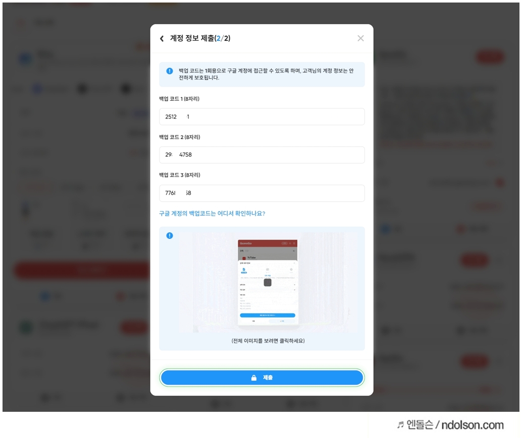 구글 백업코드를 입력합니다.