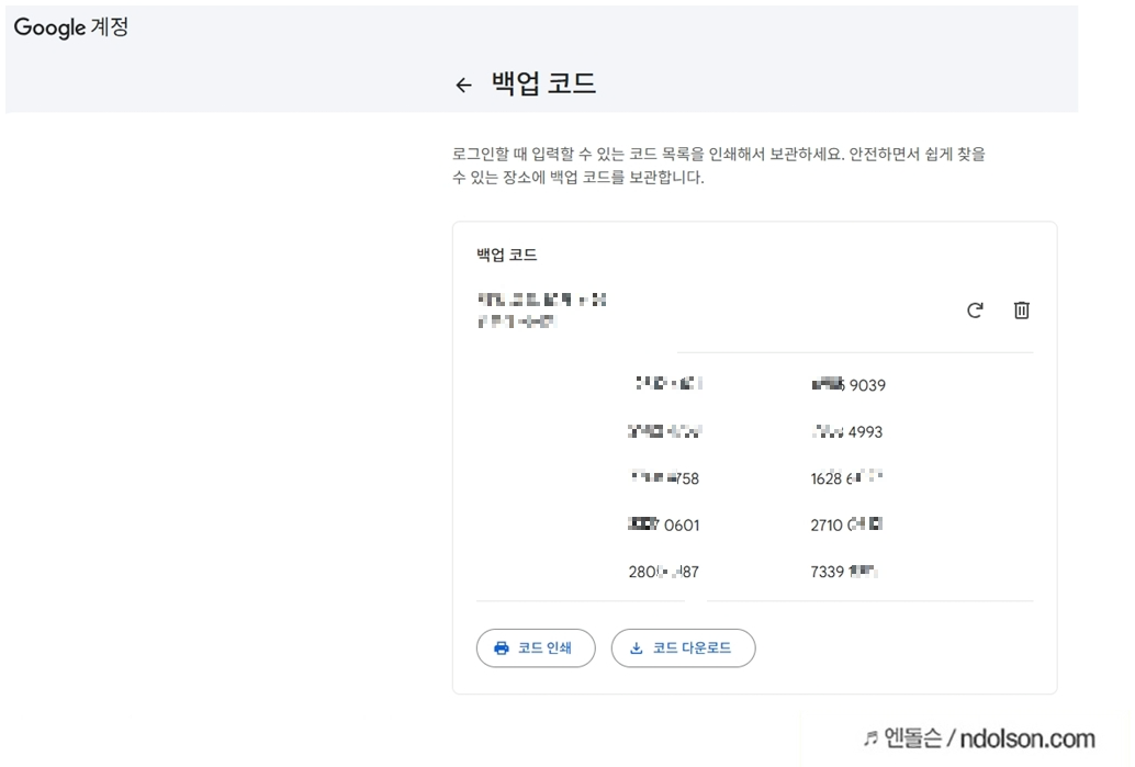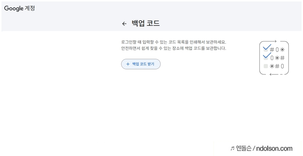 구글 [백업 코드] 받기를 눌러 줍니다.