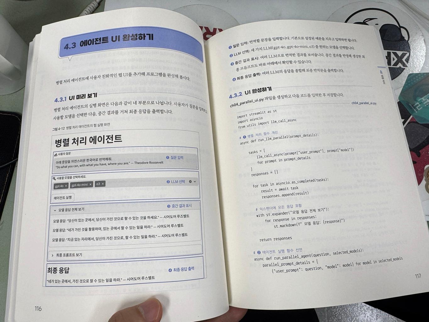 백엔드 로직만으로는 사용자에게 감동을 주기 어렵죠. 이 책은 부록을 통해 스트림릿(Streamlit) 활용법을 아주 상세히 다룹니다. 파이썬만으로 세련된 웹 인터페이스를 만들 수 있어, 개발팀 내에서 프로토타입을 만들어 팀장님께 공유하거나 사내 데모를 진행할 때 정말 유용했습니다. 특히 '세션 상태(Session State)' 관리 부분은 상태 유지가 중요한 에이전트 앱 개발에서 반드시 짚고 넘어가야 할 핵심 개념입니다.