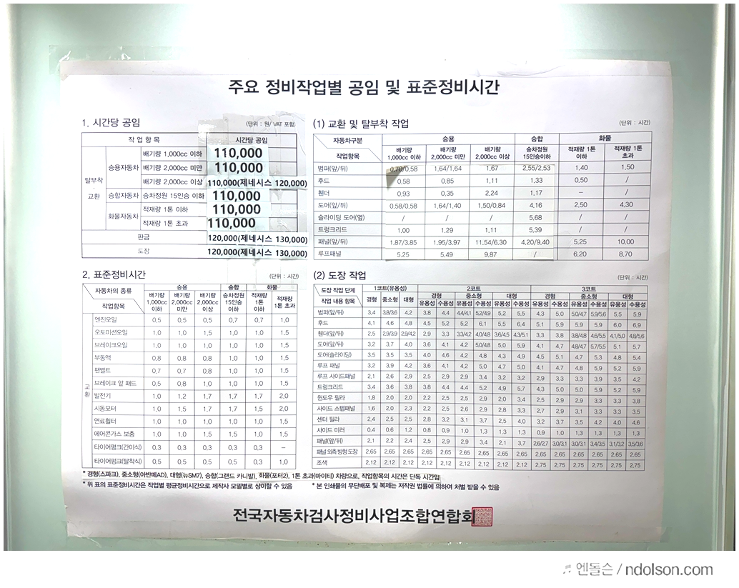 📸 석촌현대서비스 표준 공임표로 보는 점검비 제가 방문했던 석촌 호수 근처 석촌현대서비스의 공임표를 확인해 보니 다음과 같았습니다.