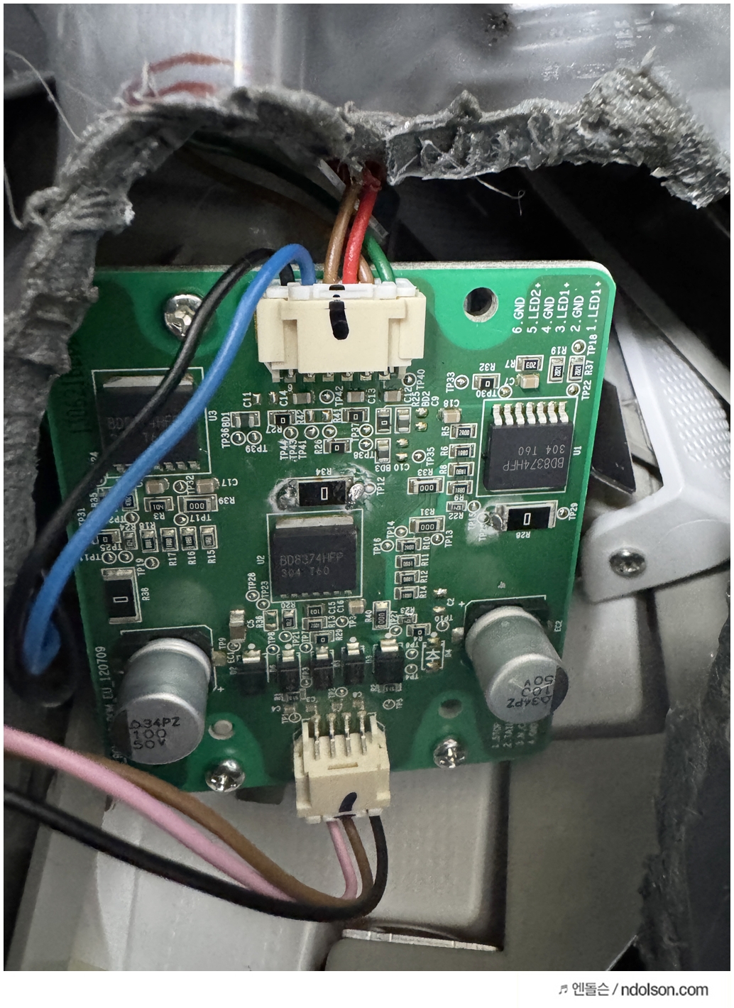 기판은 램프 안쪽에 밀봉되어 있습니다. 인두기 끝을 달궈서 뒷면 플라스틱을 사각형 모양으로 따내야 합니다. 기판이 다치지 않게 조심스럽게 절개해 주세요.