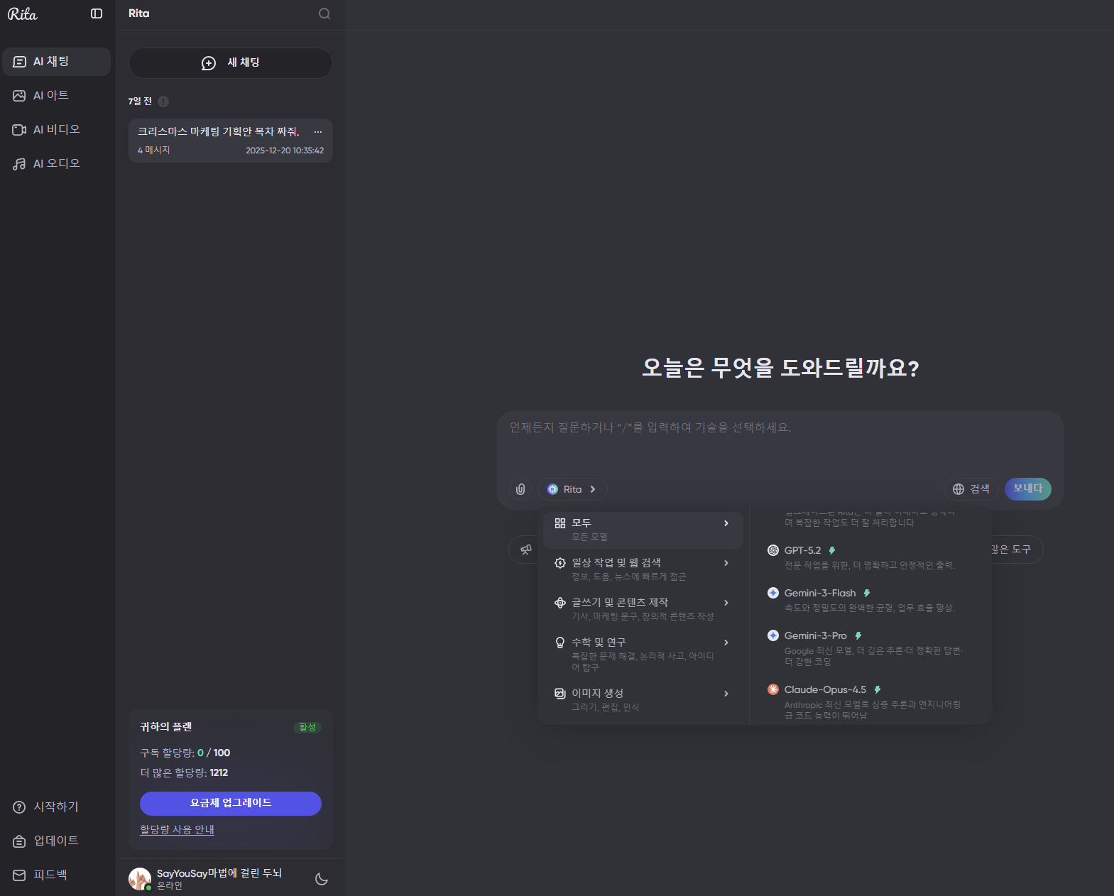특히 저처럼 글 쓸 때는 Claude, 이미지 만들 때는 Midjourney, 검색할 때는 GPT-4o를 번갈아 쓰는 '헤비 유저'에게는 개별 구독보다 Rita의 통합 크레딧 시스템이 경제적으로 훨씬 이득이었습니다.
