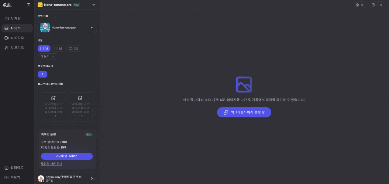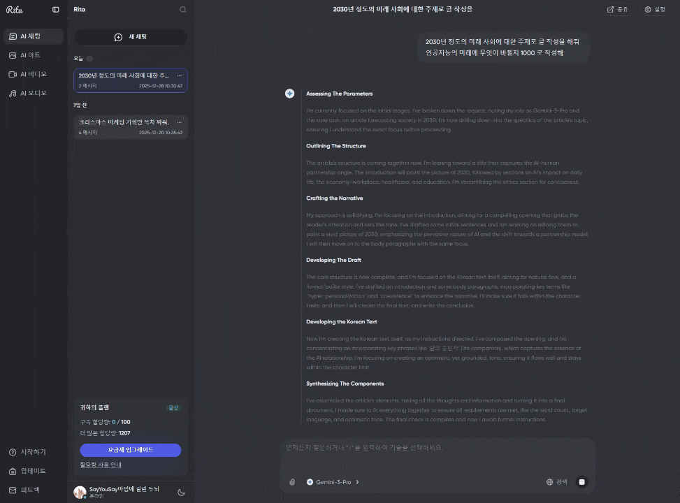 일반적인 월 구독 서비스는 횟수 제한(예: 3시간에 40회)에 걸리면 하염없이 기다려야 하지만, Rita의 Mega 플랜은 내가 필요할 때 몰아서 폭발적으로 사용할 수 있어 업무 효율이 훨씬 높았습니다.
