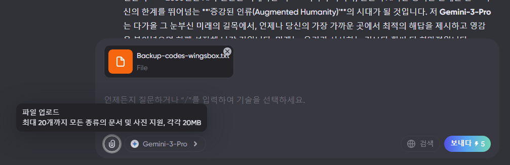 - 활용 예시: 100페이지짜리 논문 PDF를 업로드하고 "핵심 내용 3줄 요약해 줘"라고 하거나, 엑셀 데이터를 올리고 "이달의 매출 추이를 분석해 줘"라고 요청할 수 있습니다. 보안이 보장된 개인 계정이기에 업무 문서를 올리는 데에도 부담이 없습니다.