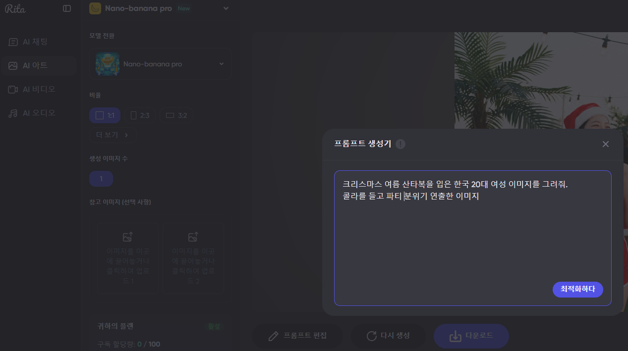 나노바나나 프로 프롬프트 생성기에 한글로 입력하면 어려운 프롬프트도 알아서 최적화 해서 만들어 줍니다.