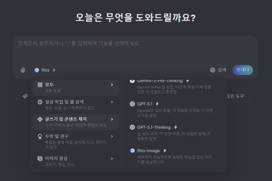 Rita Chat의 가장 큰 매력은 대화 도중에도 AI의 두뇌를 교체할 수 있다는 점입니다.