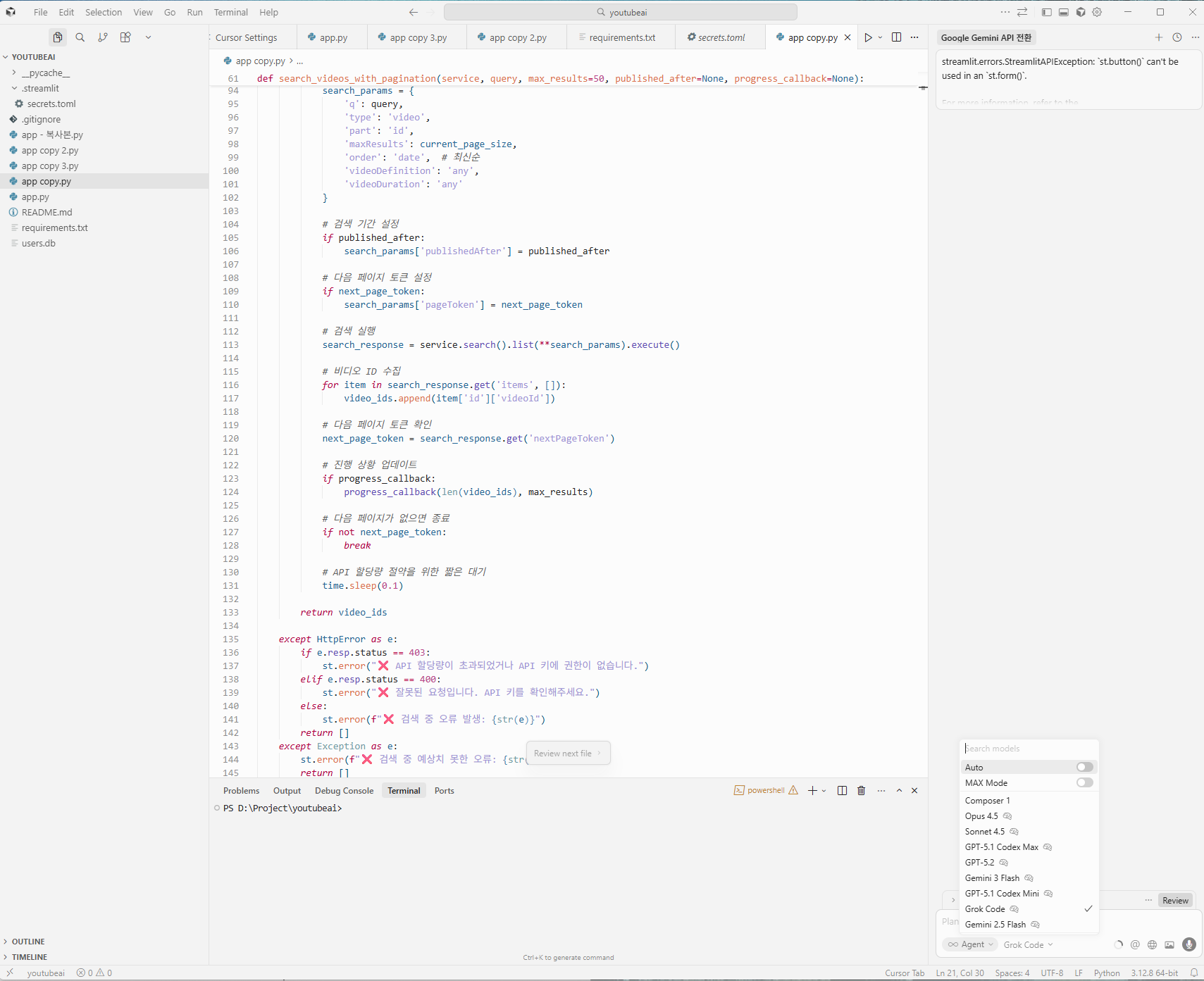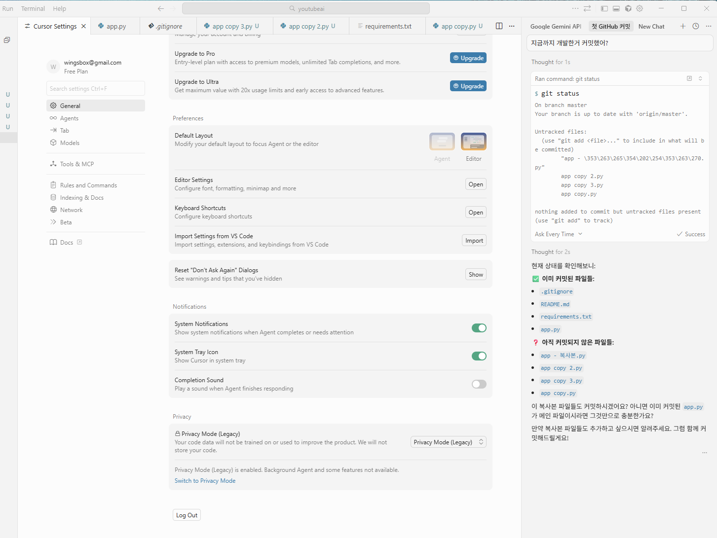 - Composer 기능: "이 기능 통째로 구현해줘"라고 명령하면 여러 파일을 오가며 프로젝트 단위로 코드를 작성해 줍니다. 이건 정말 마법 같습니다.