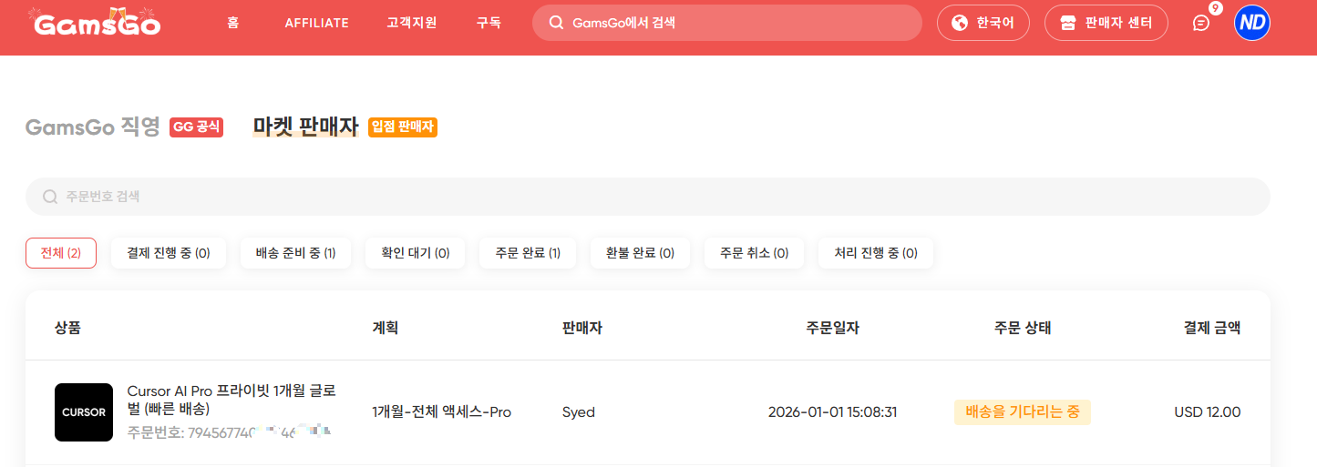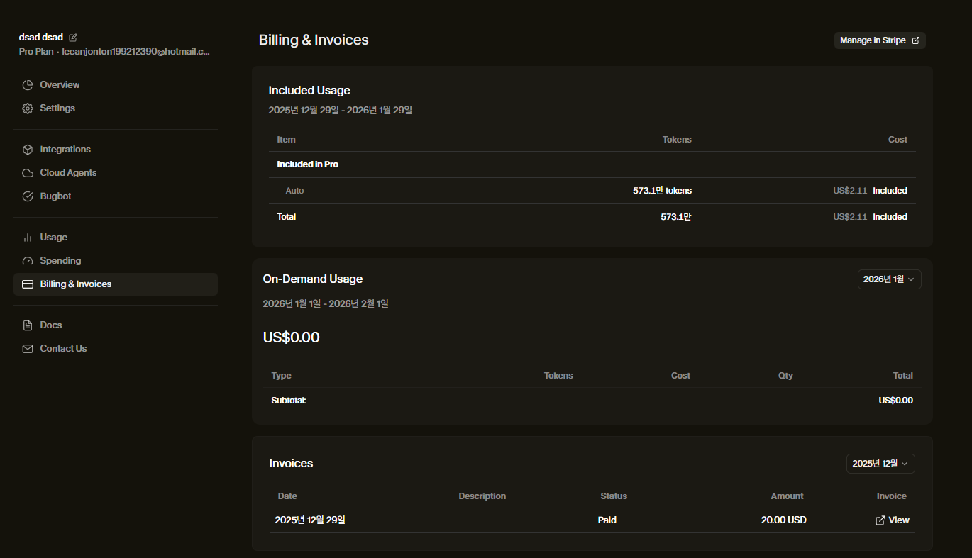 나의 구독에 보면, 주문된 커서 AI 프로가 있습니다.
